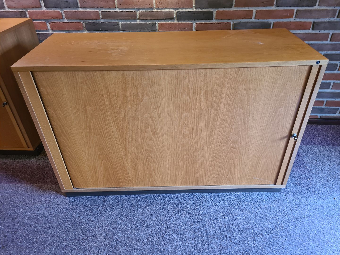 Arkivskab fra 1980'erne i finéret eg med jalousi låge. Fremstår pænt og velholdt, dog med lettere brugsspor på toppen. (Billeder) Forskellige indretningsformer haves. Fungerende nøgle medfølger.