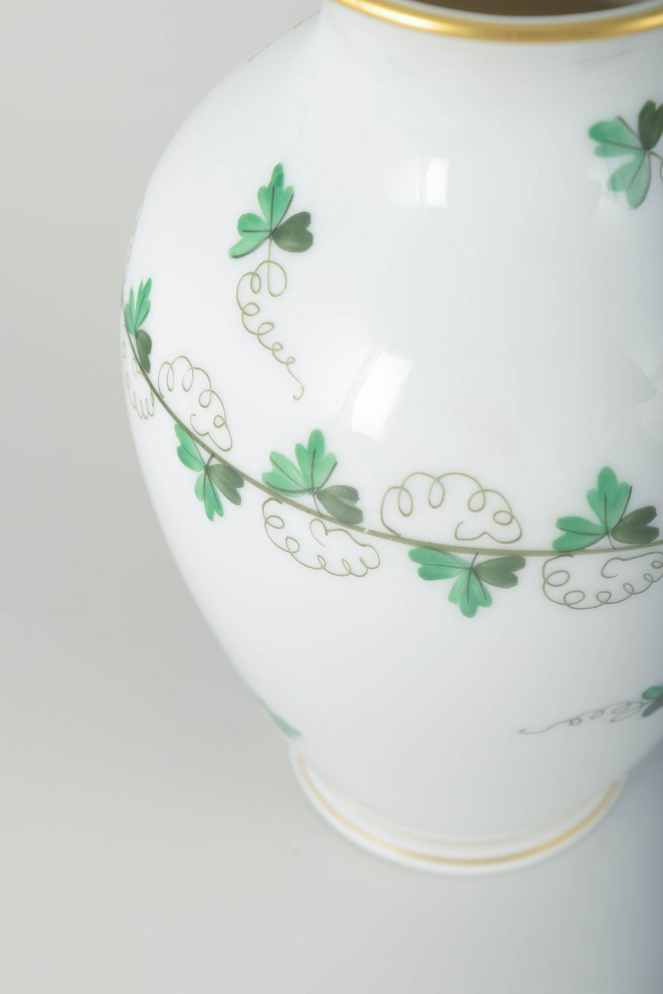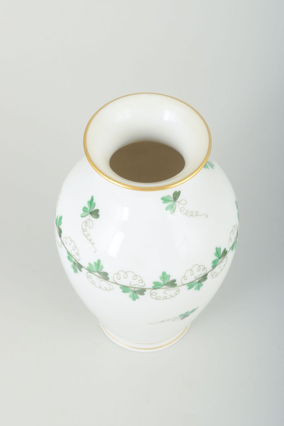 Elegant porcelæns­vase med håndmalet grønt bladdekor og fine detaljer i guld. Klassisk form med svungen korpus og afrundet fod, afsluttet med guldkant ved åbningen.