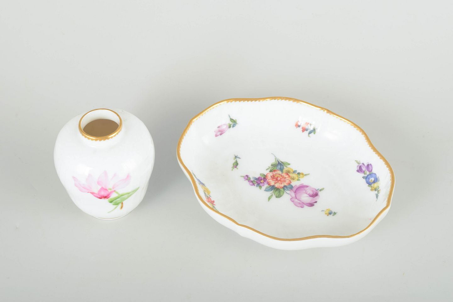Porcelænssæt bestående af en lille balusterformet vase med håndmalet blomsterdekoration og guldkant samt et ovalt kagefad dekoreret i det klassiske “Sachsisk Blomst” mønster.