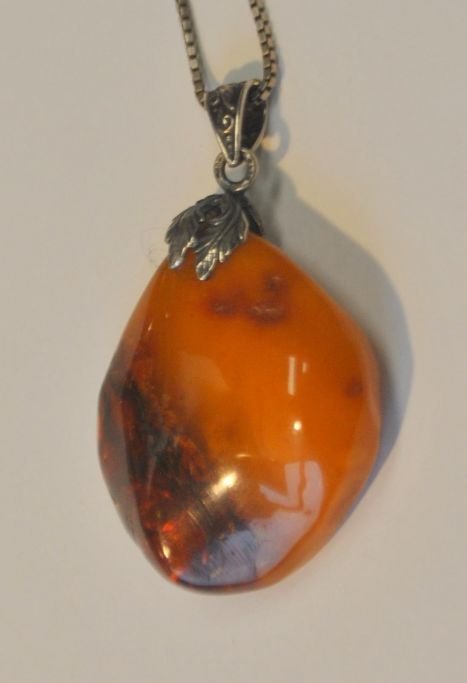 Rav halskæde, N. E. From, Nakskov (efter 1944), Danmark. Poleret rav. OPhæng i sterling sølv med bladværk og blomster. Dertil sterlingkæde, længde: 42 cm. Fra GIFA.