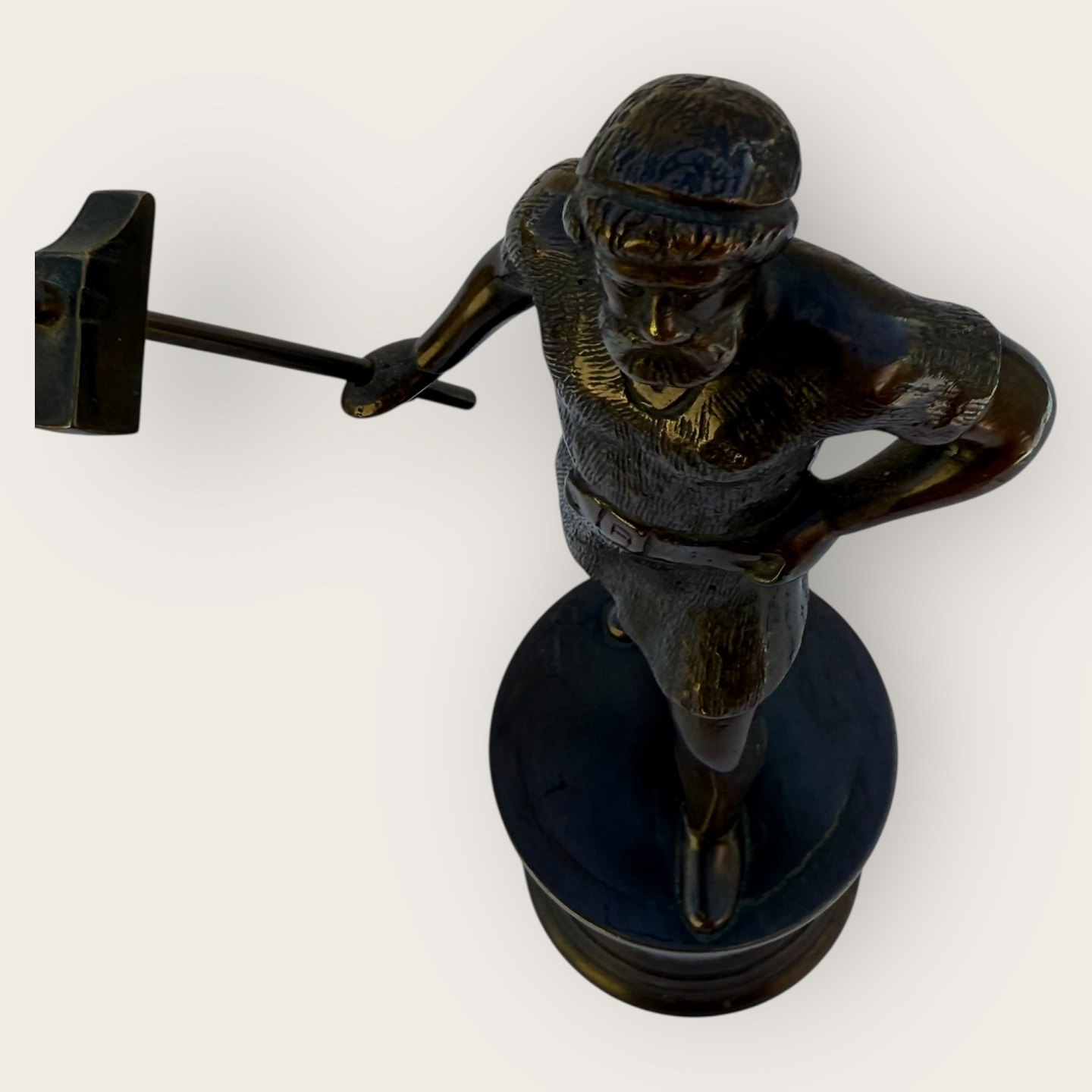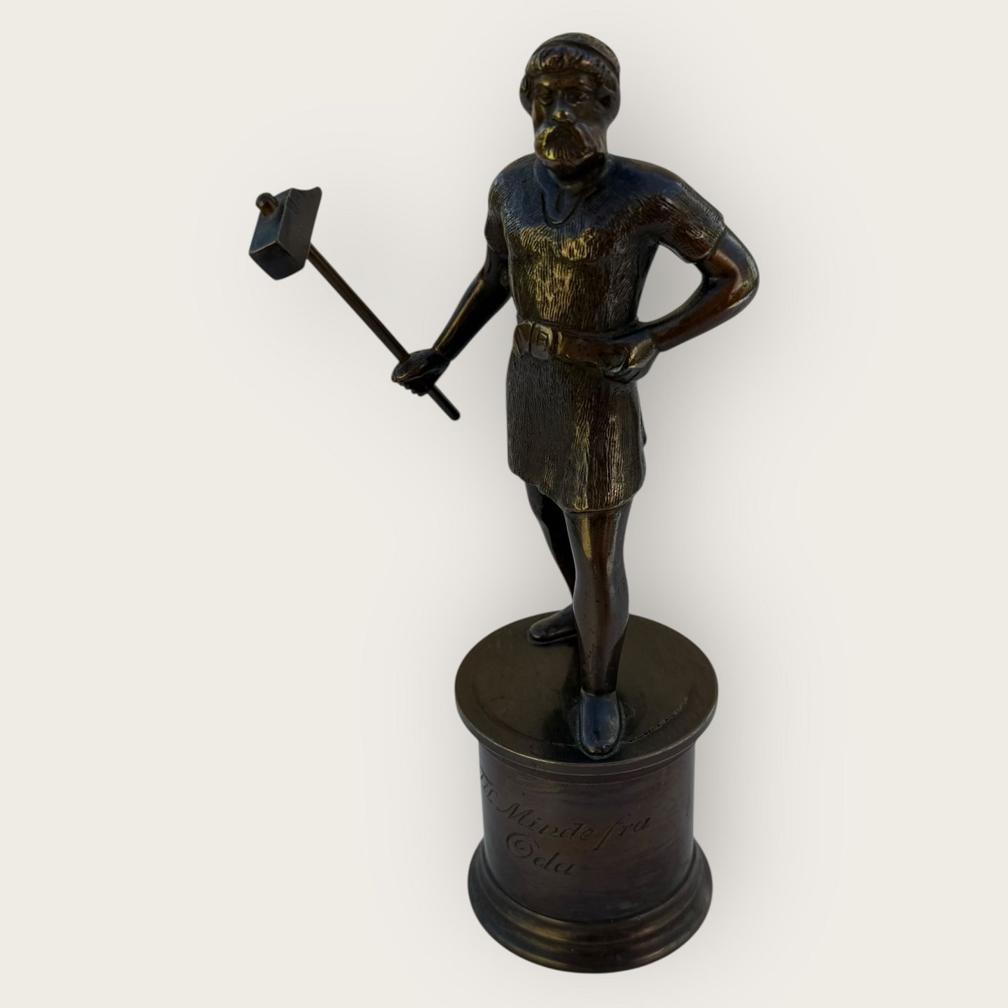 Bronze figure of the God Thor with his hammer, small crack in the base at his foot (see photo) otherwise good condition, engraved: In memory of Oda, Height 19cm