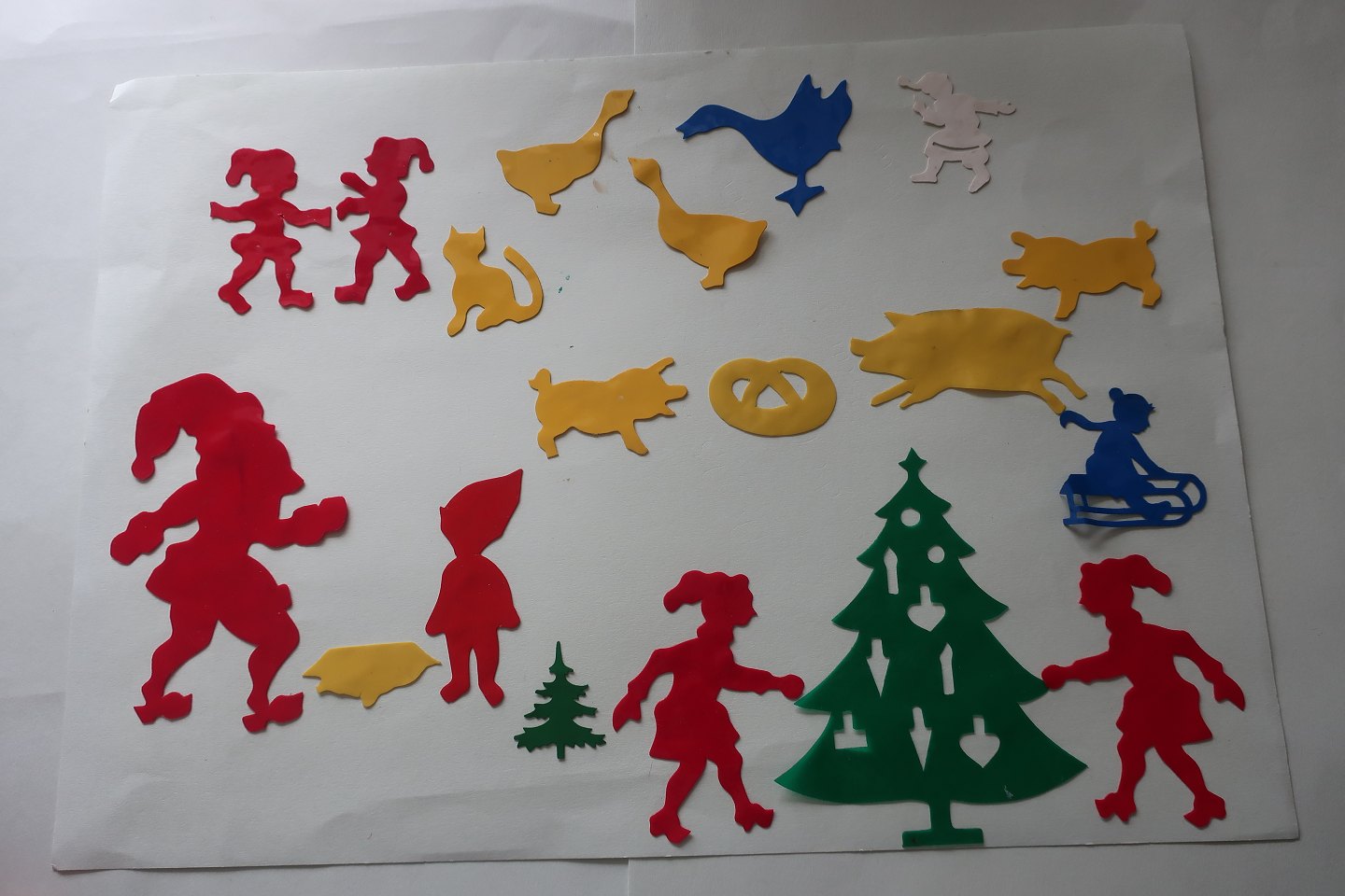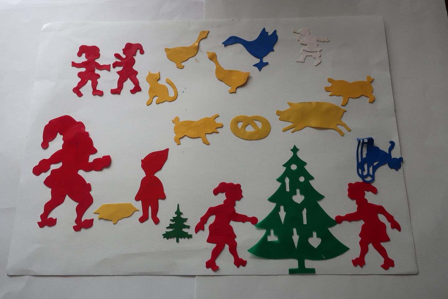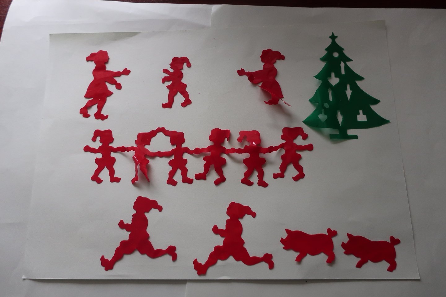 Julemotiverne (af plastik), klæber direkte på vinduerne/køleskab o.l., kun ved den fugt, som er der