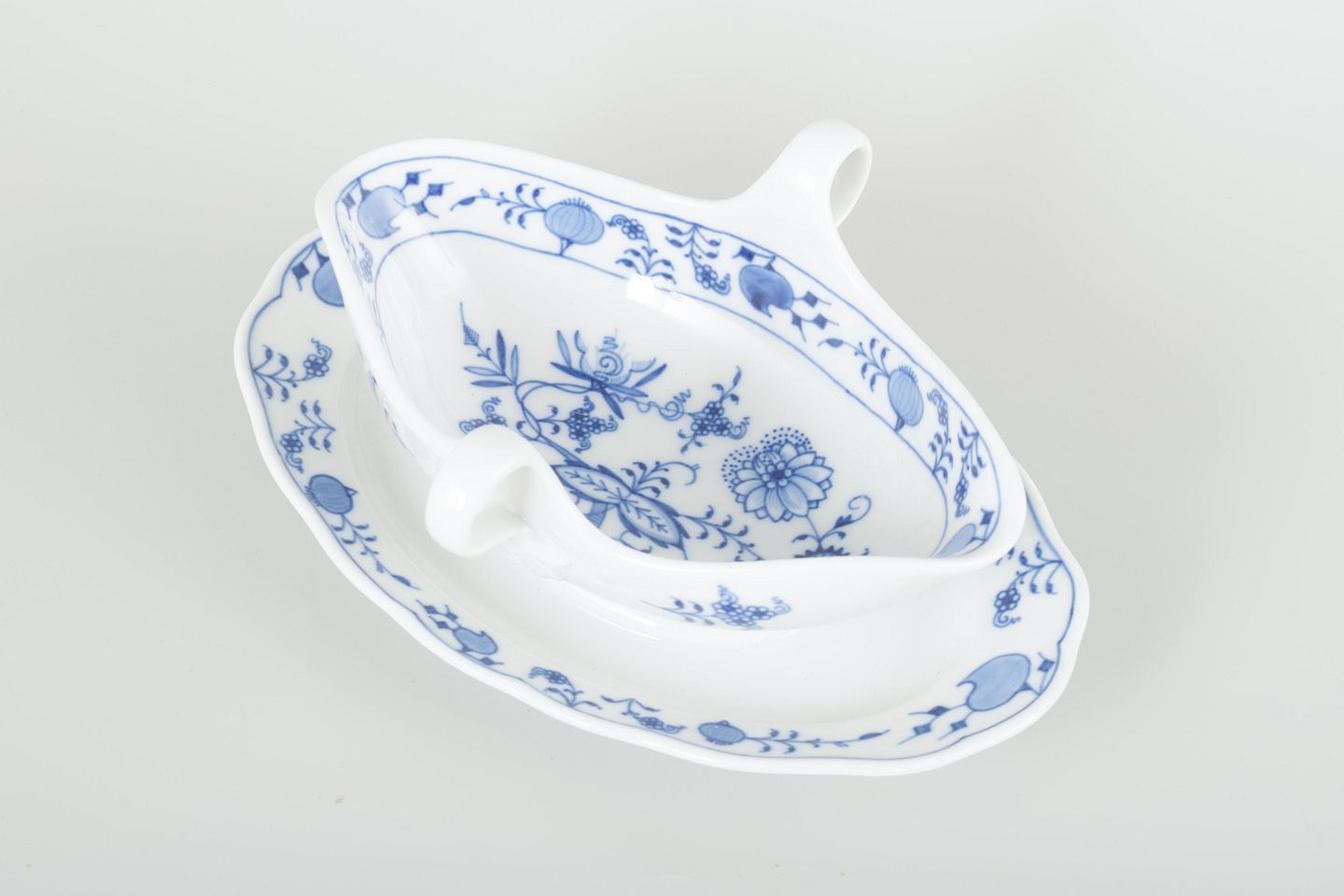 Elegant sovseskål i hvidt porcelæn med fastmonteret fad og dobbelt hældetud. Håndmalet underglasurdekoration i det klassiske “Løgmønstret” (Blue Onion) mønster.
