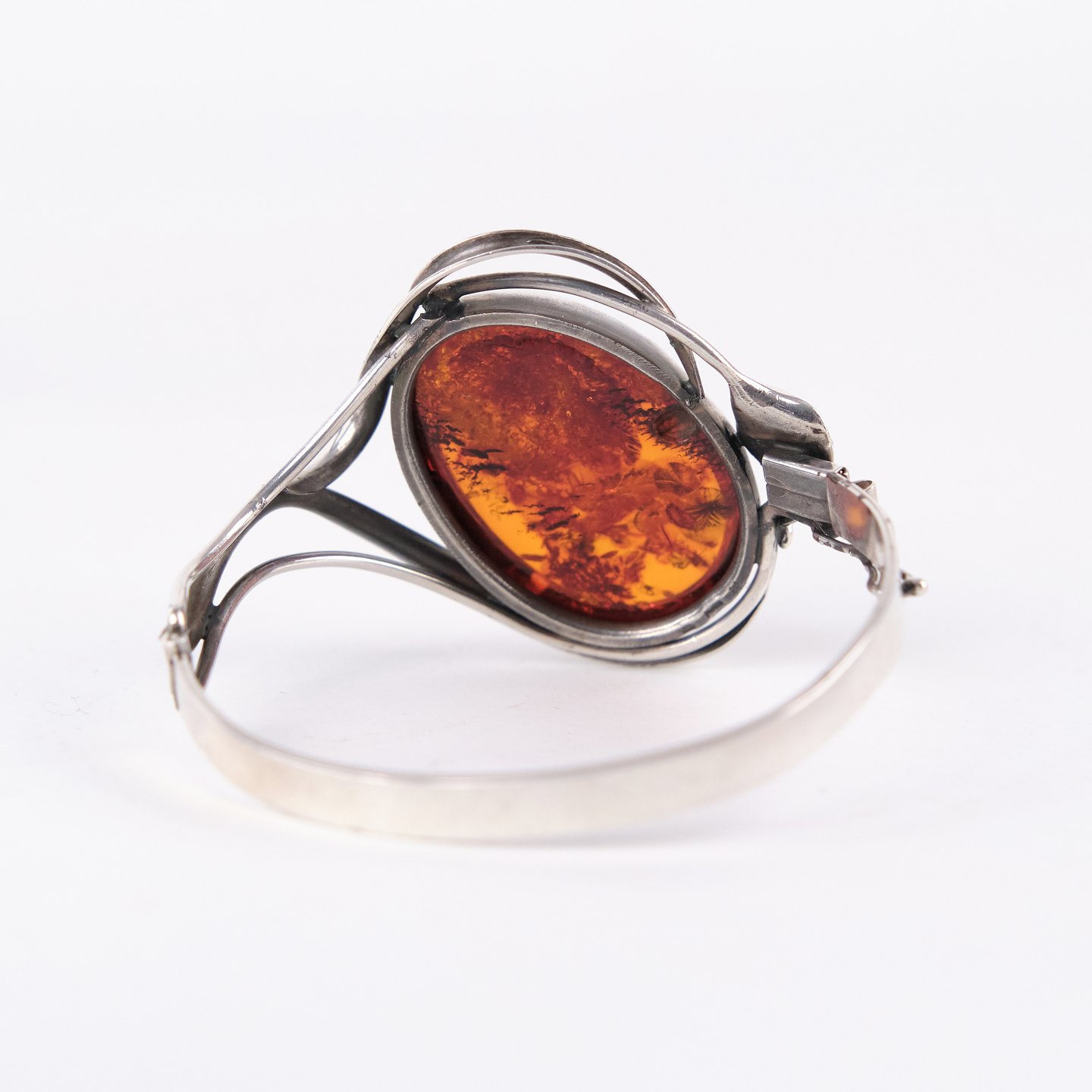 Armring i sølv med rav og sikkerhedslås. Unikt smykke design med rav.