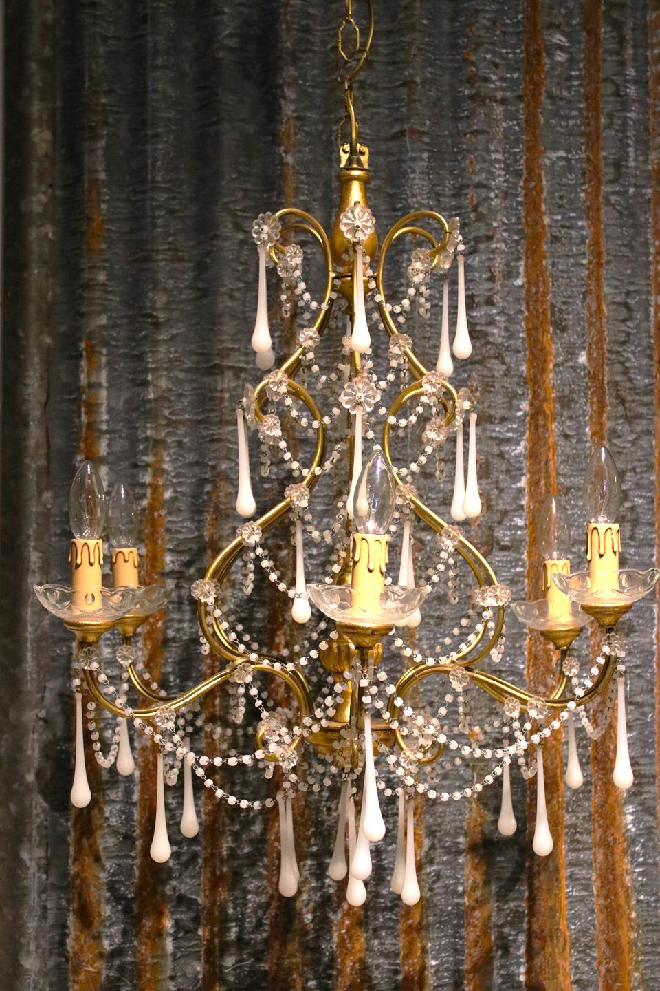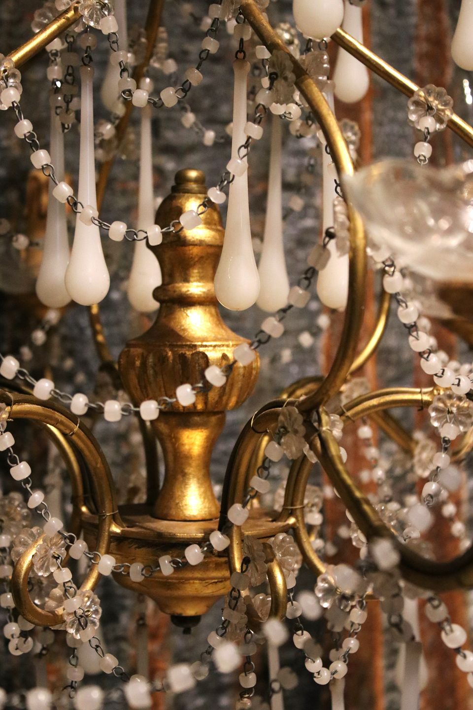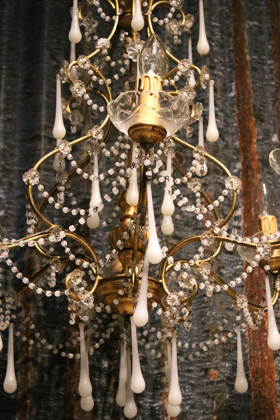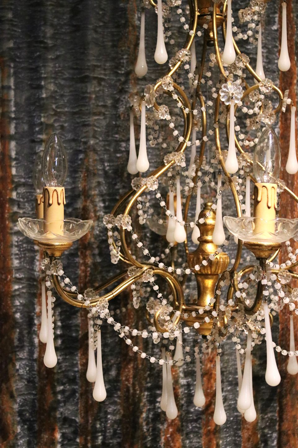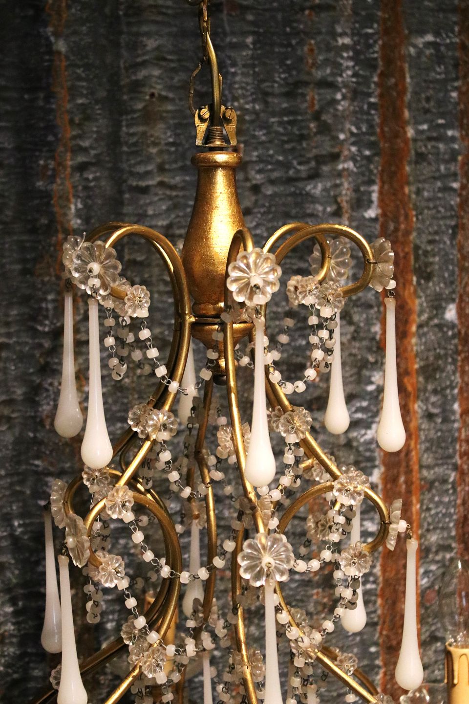 Fransk lysekrone i forgyldt metal og træ , dekoreret med hvide glas dråber og kæder. Lysekronen har 6 lyskilder.