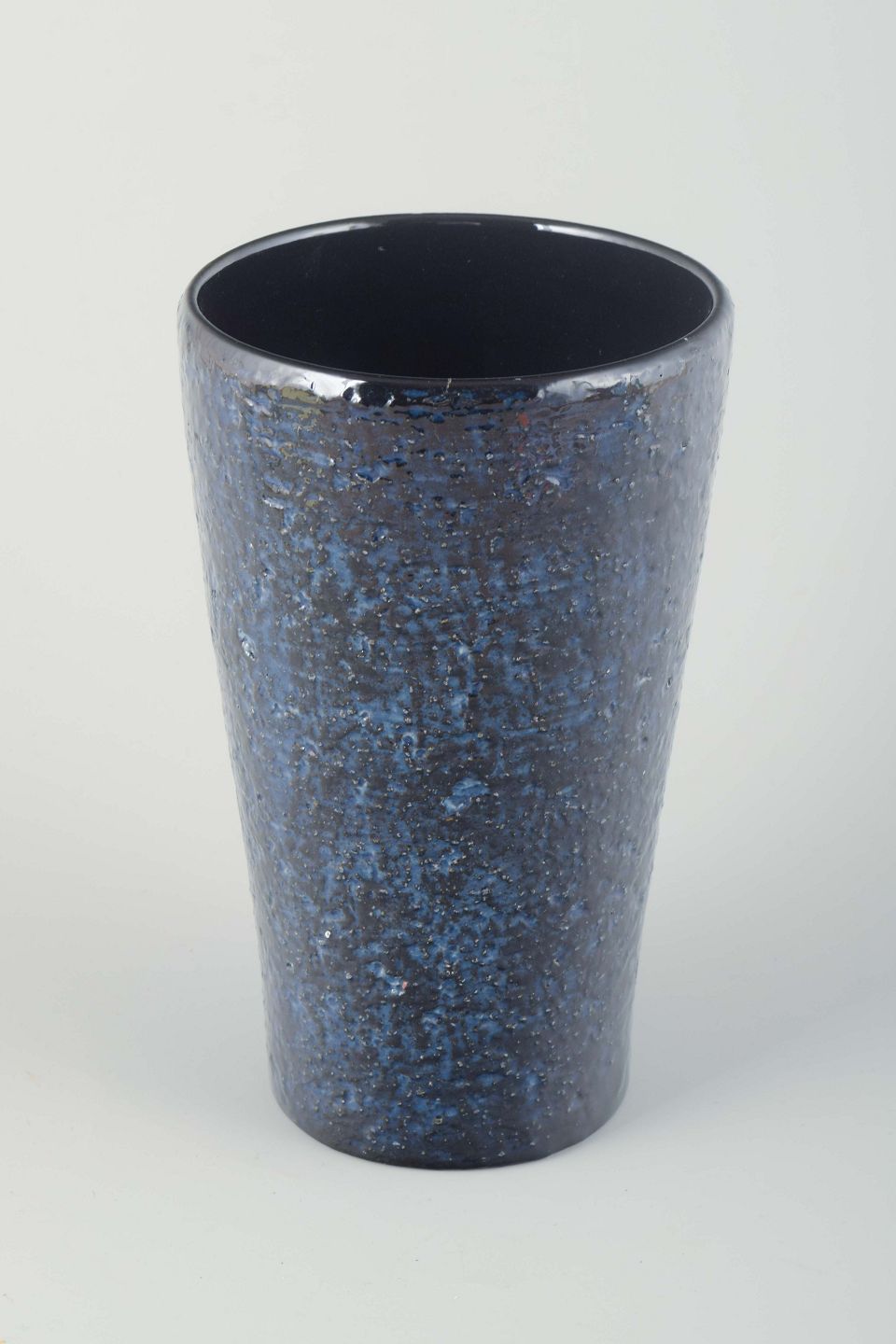 Cylindrisk vase i stentøj med dyb, mørkeblå glasur med let krystallinsk struktur.