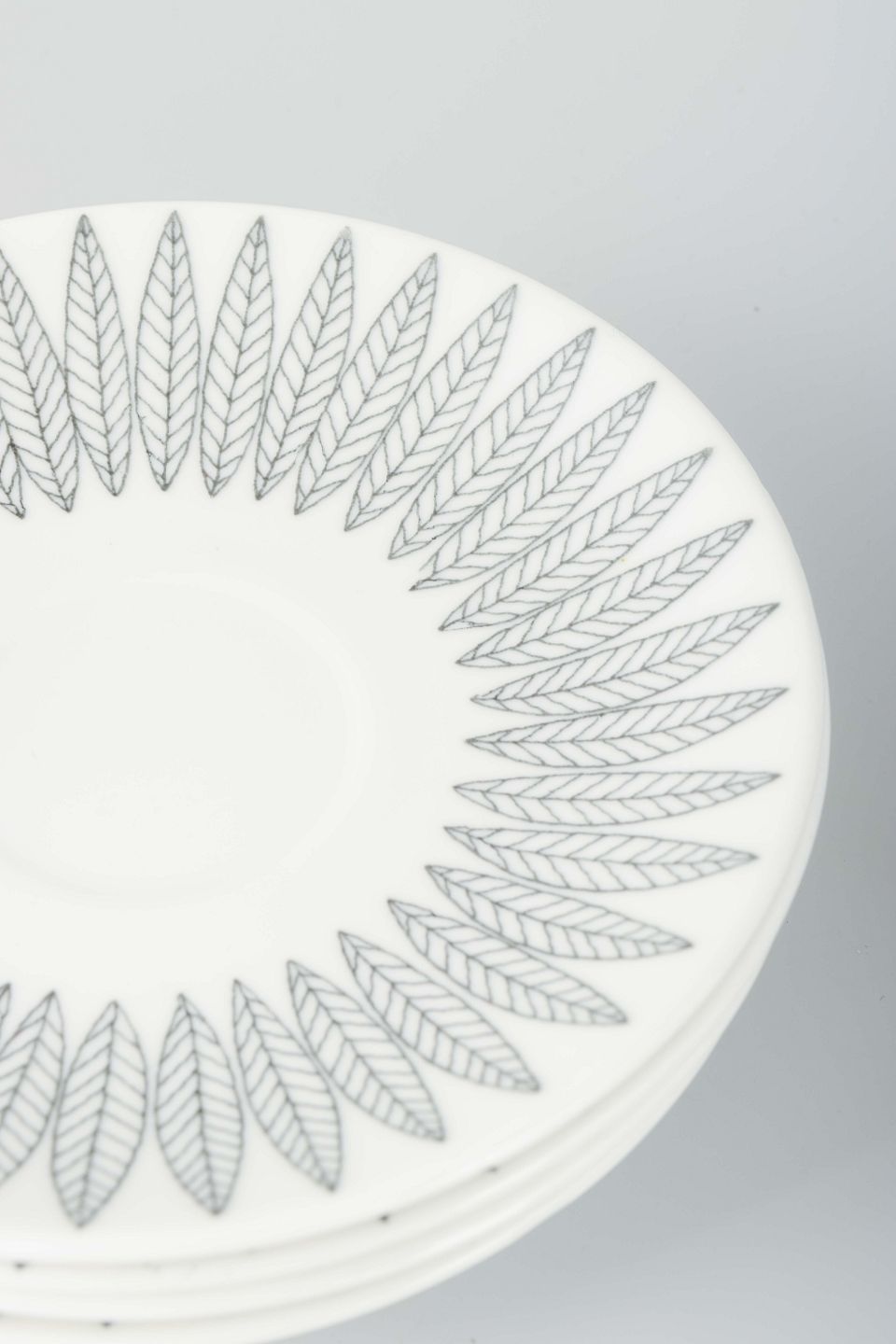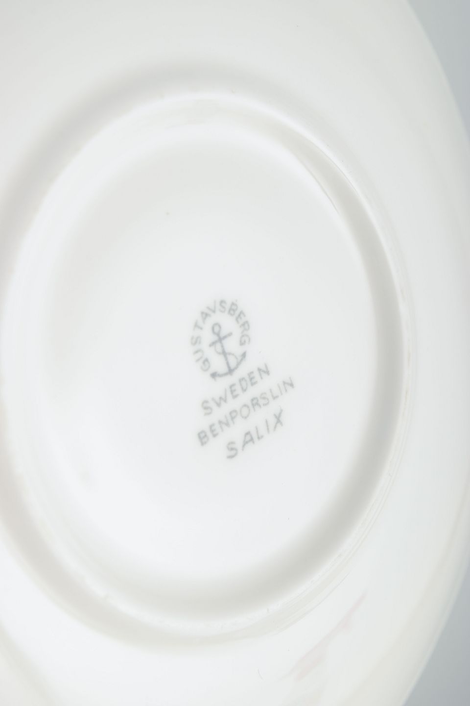 Fajance med det karakteristiske “Salix”-mønster i grå på hvid bund, designet af Stig Lindberg.