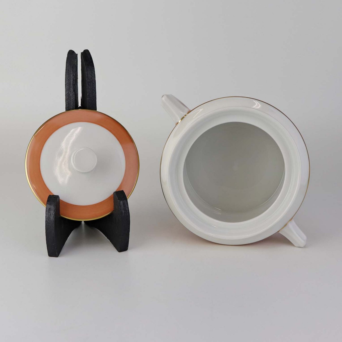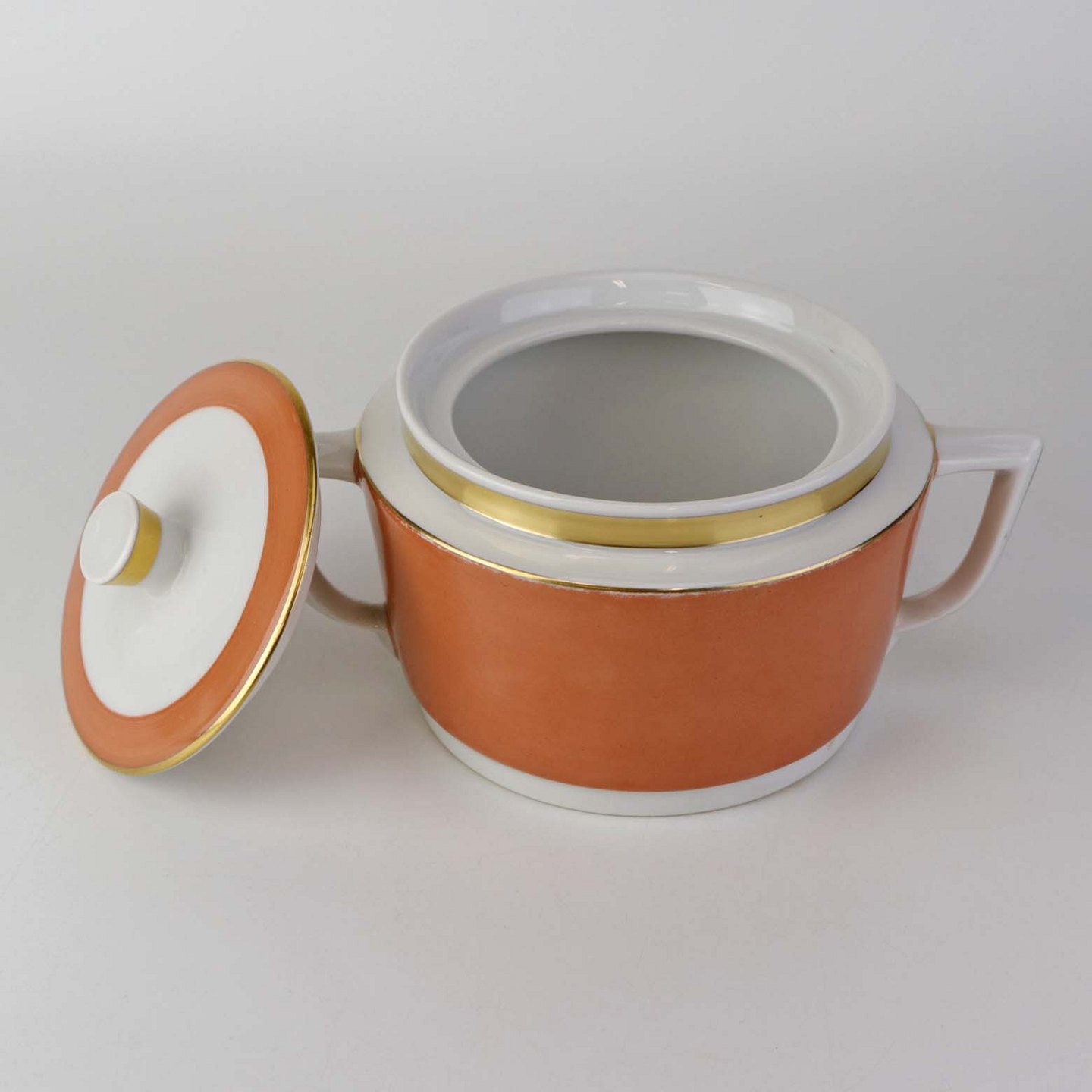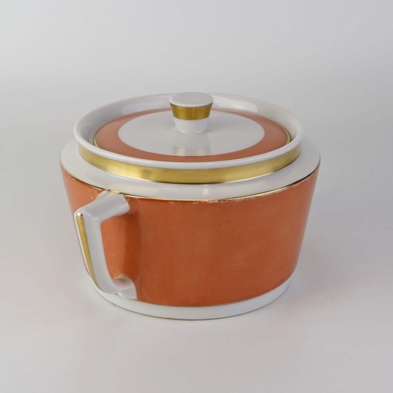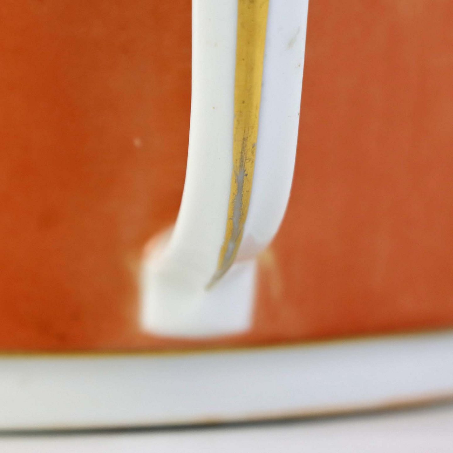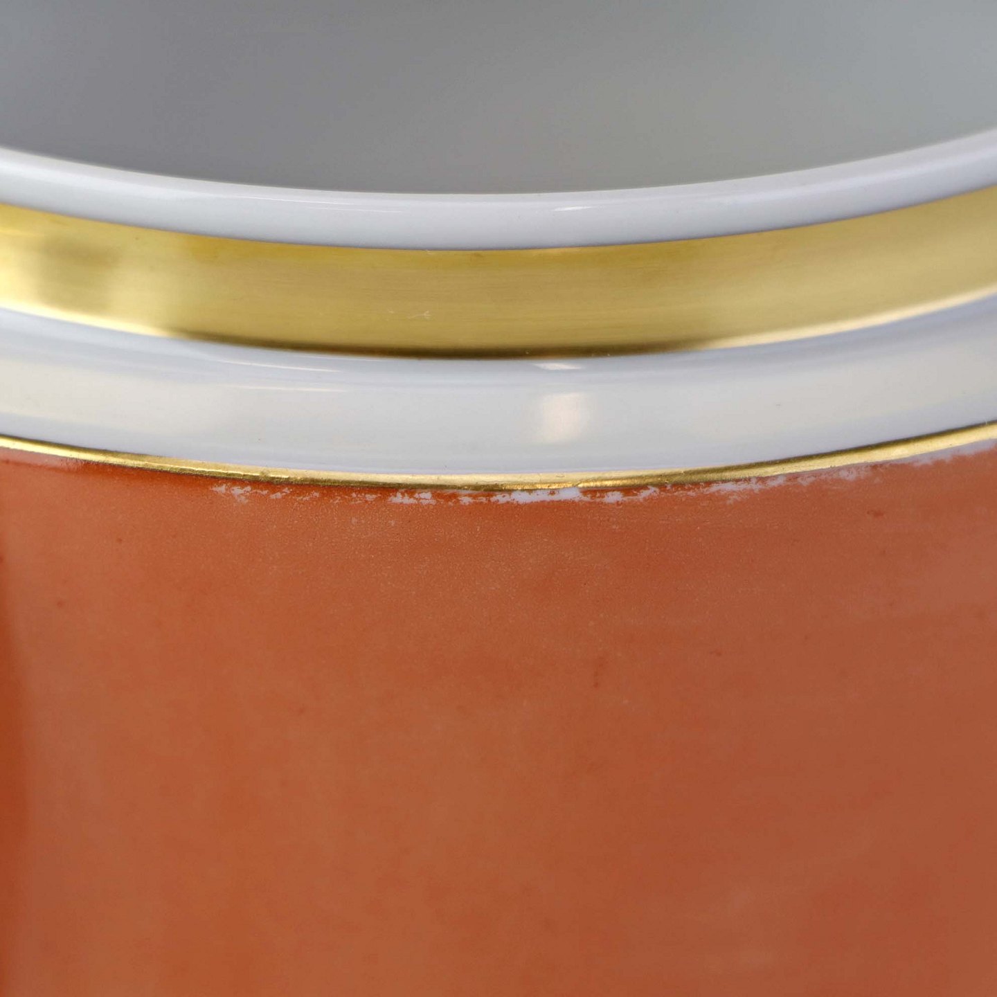 Service i glat hvidt porcelæn med orangerød dekoration over glasuren og guldkant