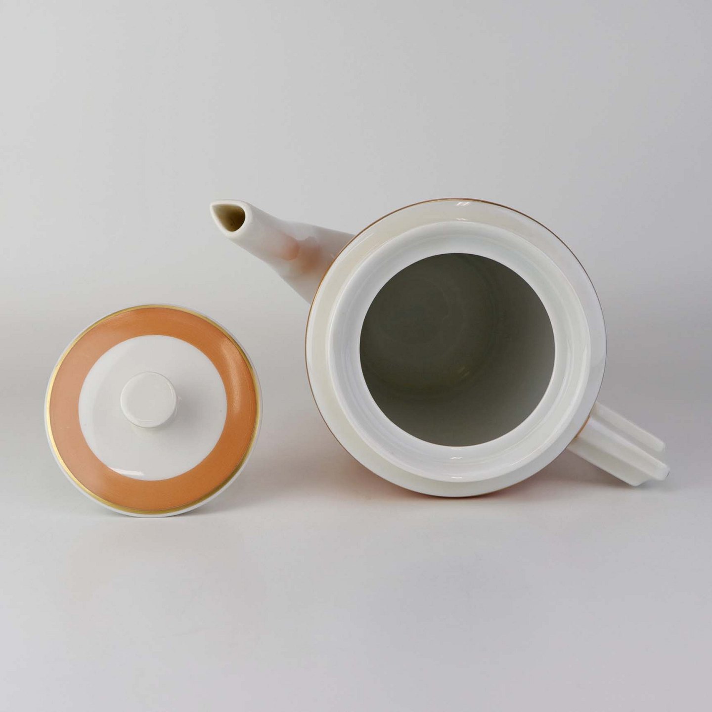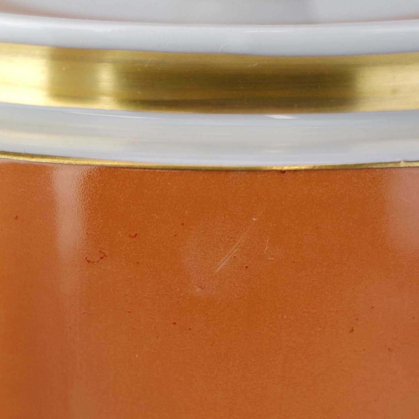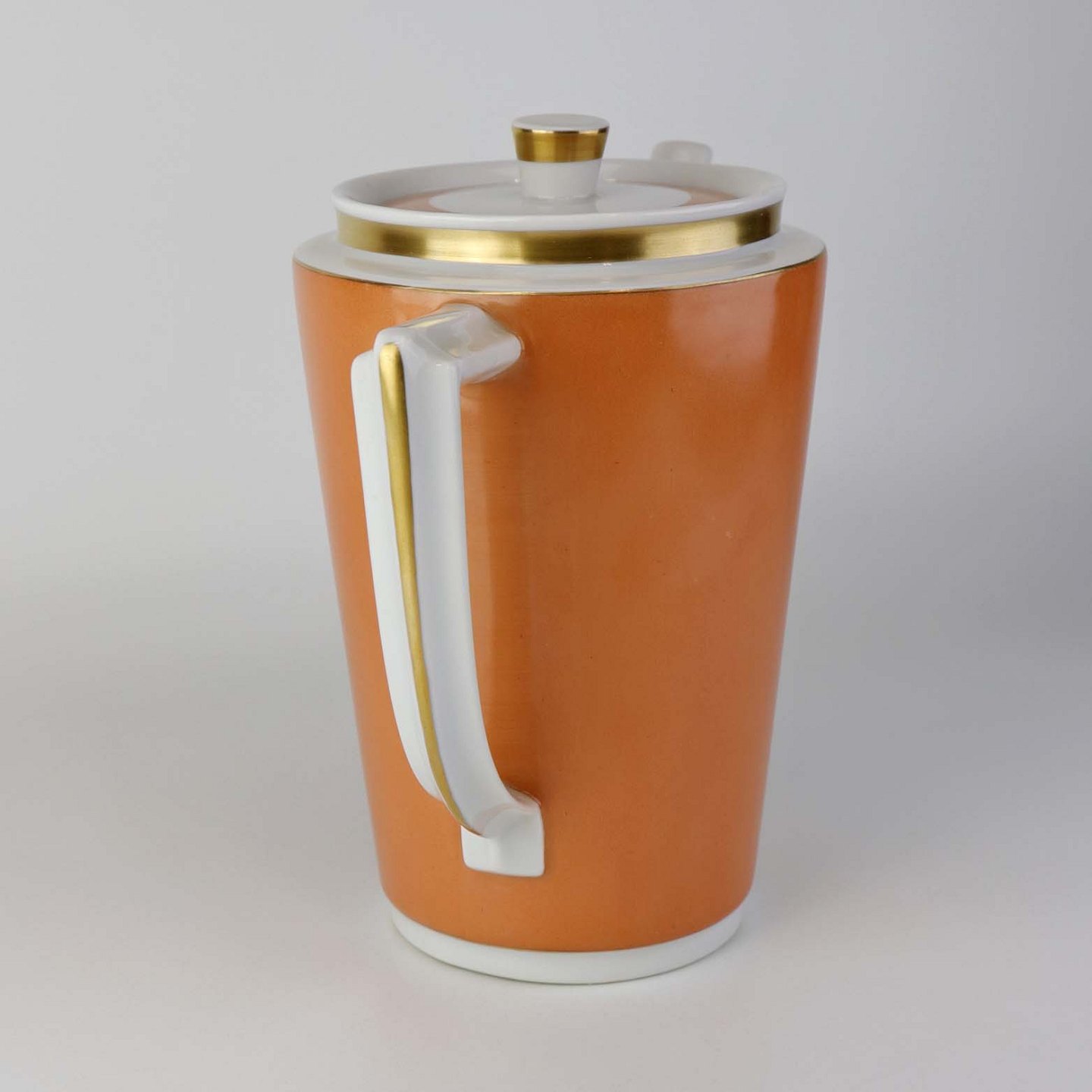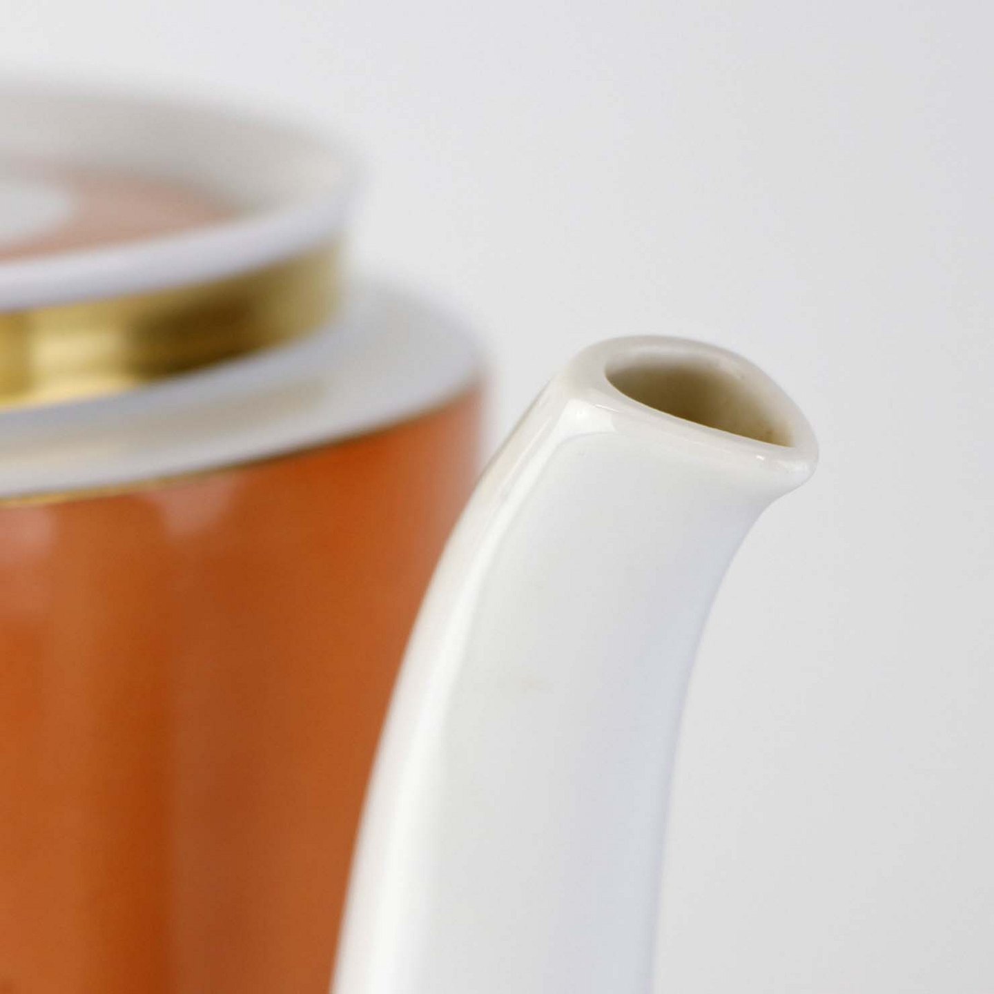 Service i glat hvidt porcelæn med orangerød dekoration over glasuren og guldkant