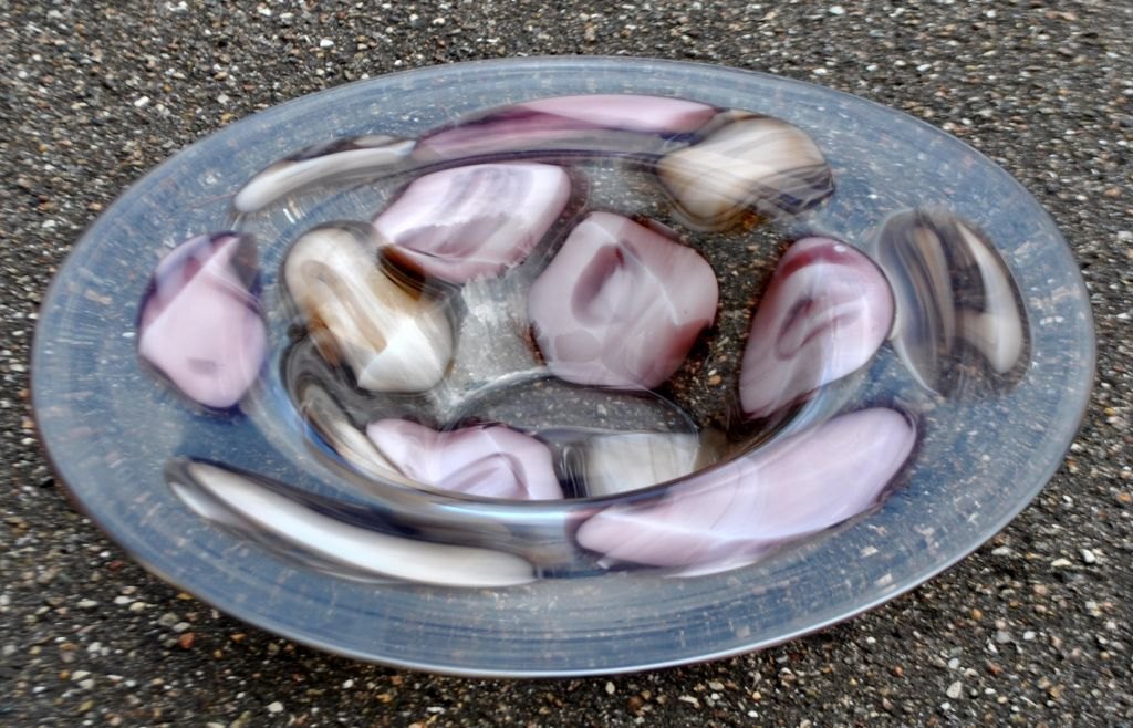 Glasfad med rosa og brun dekoration, 20. årh. Dia: 43 cm. H: 8 cm.
