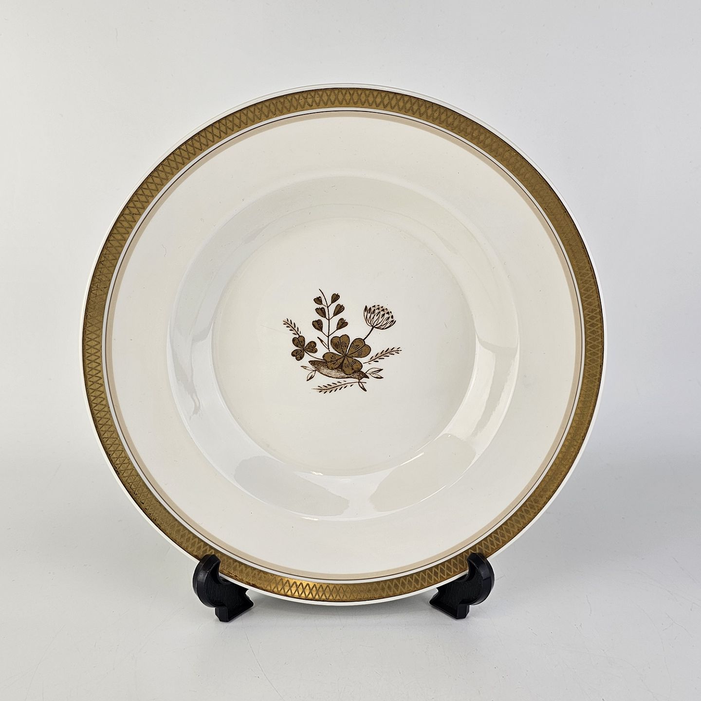 Cremefarvet porcelæn med motiv af gylden kløverblomst og bred graveret guldkant.