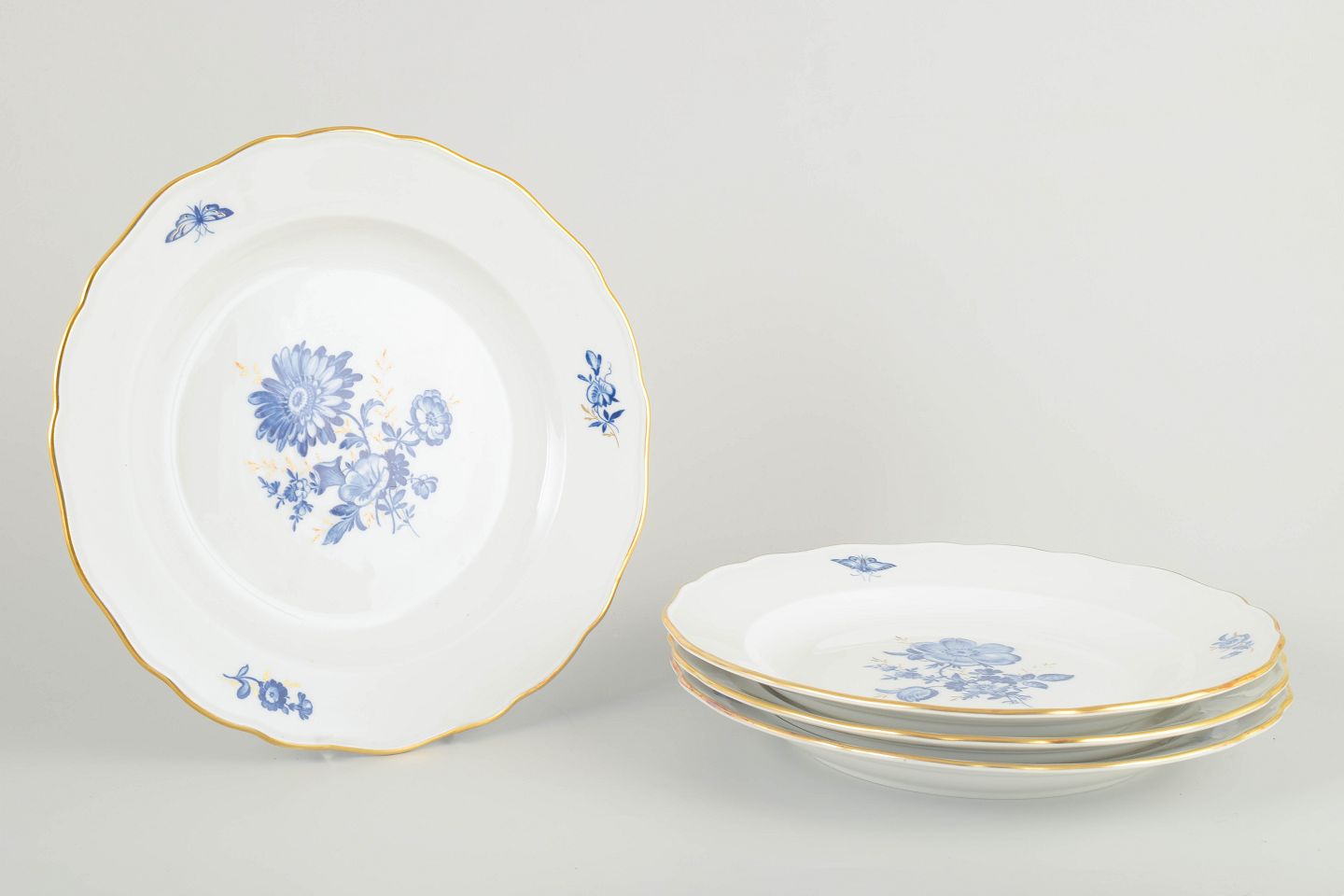Hånddekoreret porcelæn med håndmalede blå blomsterdekorationer og forgyldte stafferinger langs kanten. Klassisk let bølget form.