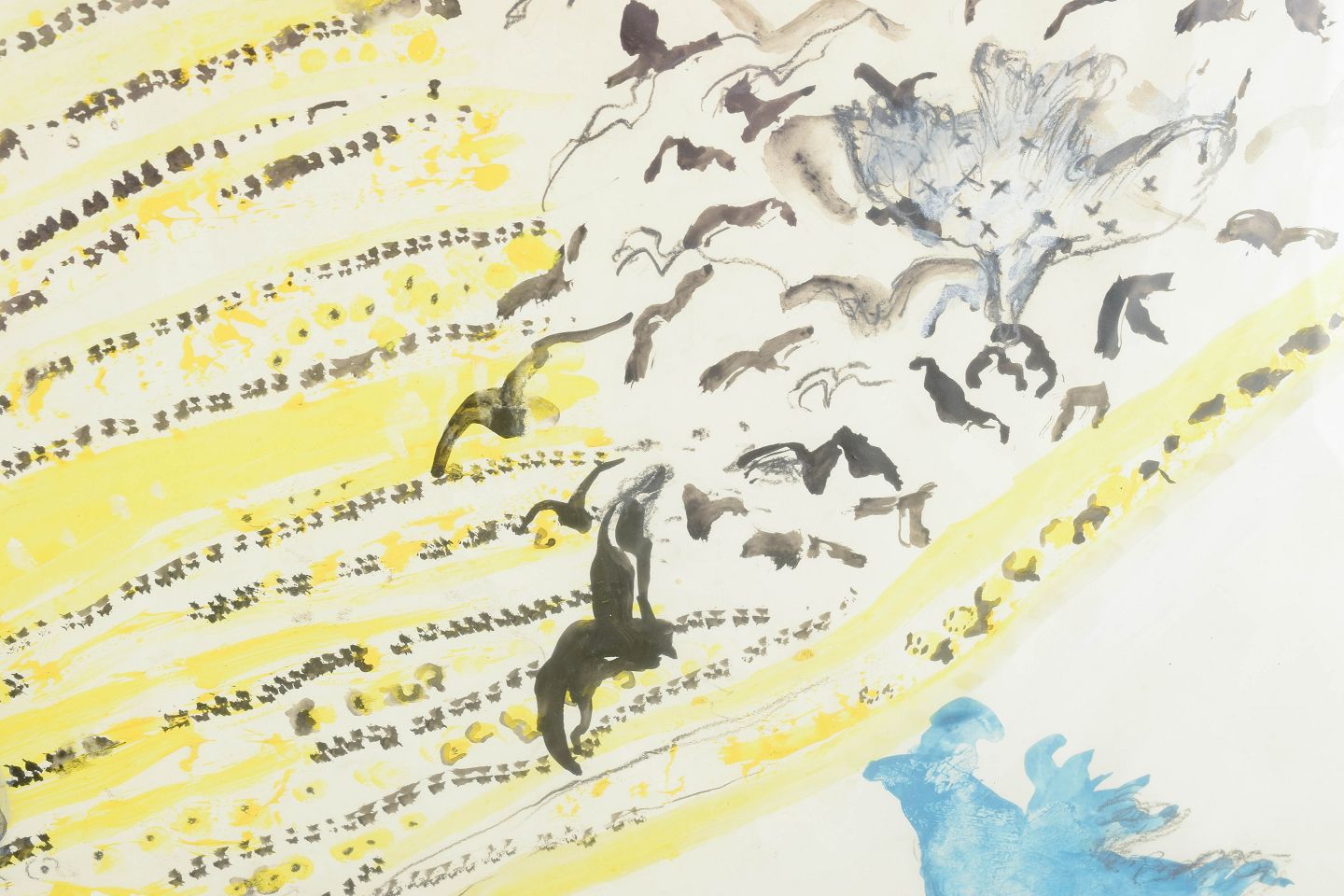 A poetic and movement-driven watercolor where musical yellow rhythms sweep diagonally across the composition, dissolving into a flock of flying bird silhouettes. Deeper organic forms appear to the left in blue-grey tones, contrasted by a lighter, floating blue figure on the right. A work of dreamlike lightness and spiritual energy.