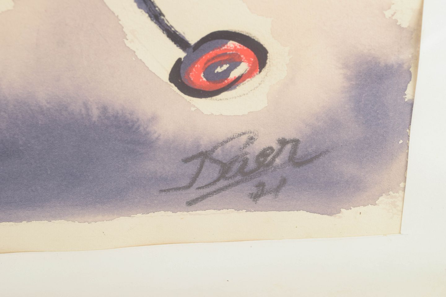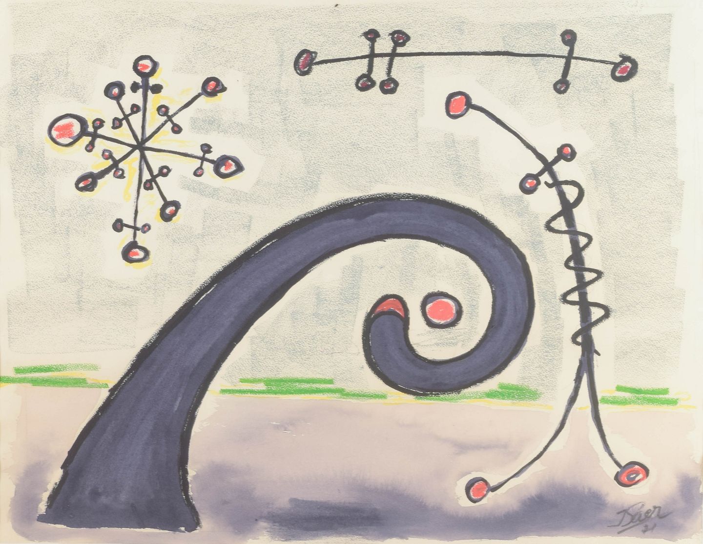 Organic–surrealist composition featuring floating molecular structures and spiral motions in a dream-like, almost cosmic space. The reddish nodes act as rhythmic accents uniting the graphic elements. Executed in light transparent watercolour, framed behind glass.
