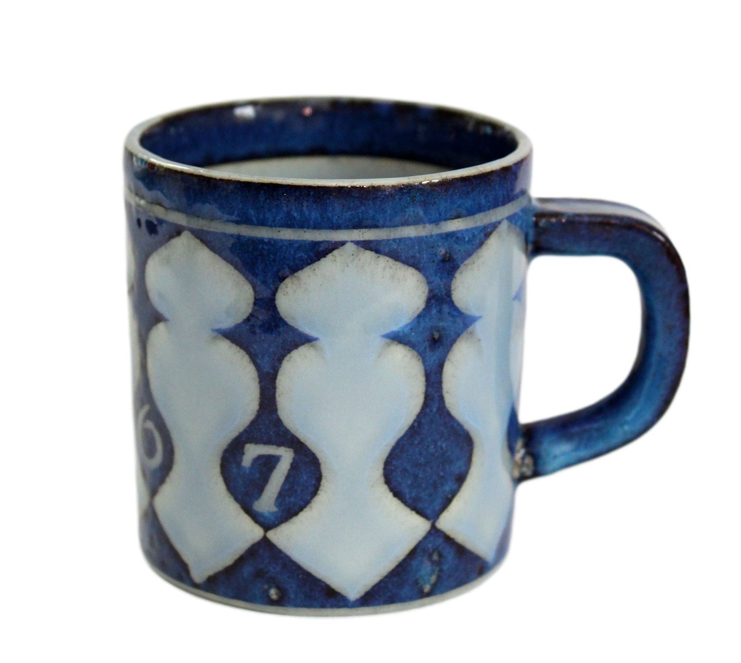 Aluminia, Lille årskrus i kunstfajance. Designer Nils Thorson. Dette er det første årskrus. Nr. 3495. Årskrus er produceret fra perioden 1967 til 2014, fra 1968 er det Royal Copenhagen. Højde 7,5 cm. Diameter 6,8 cm. Lidt ujævn bemalet kant. Pris: 700 kr. stk. Lager: 1