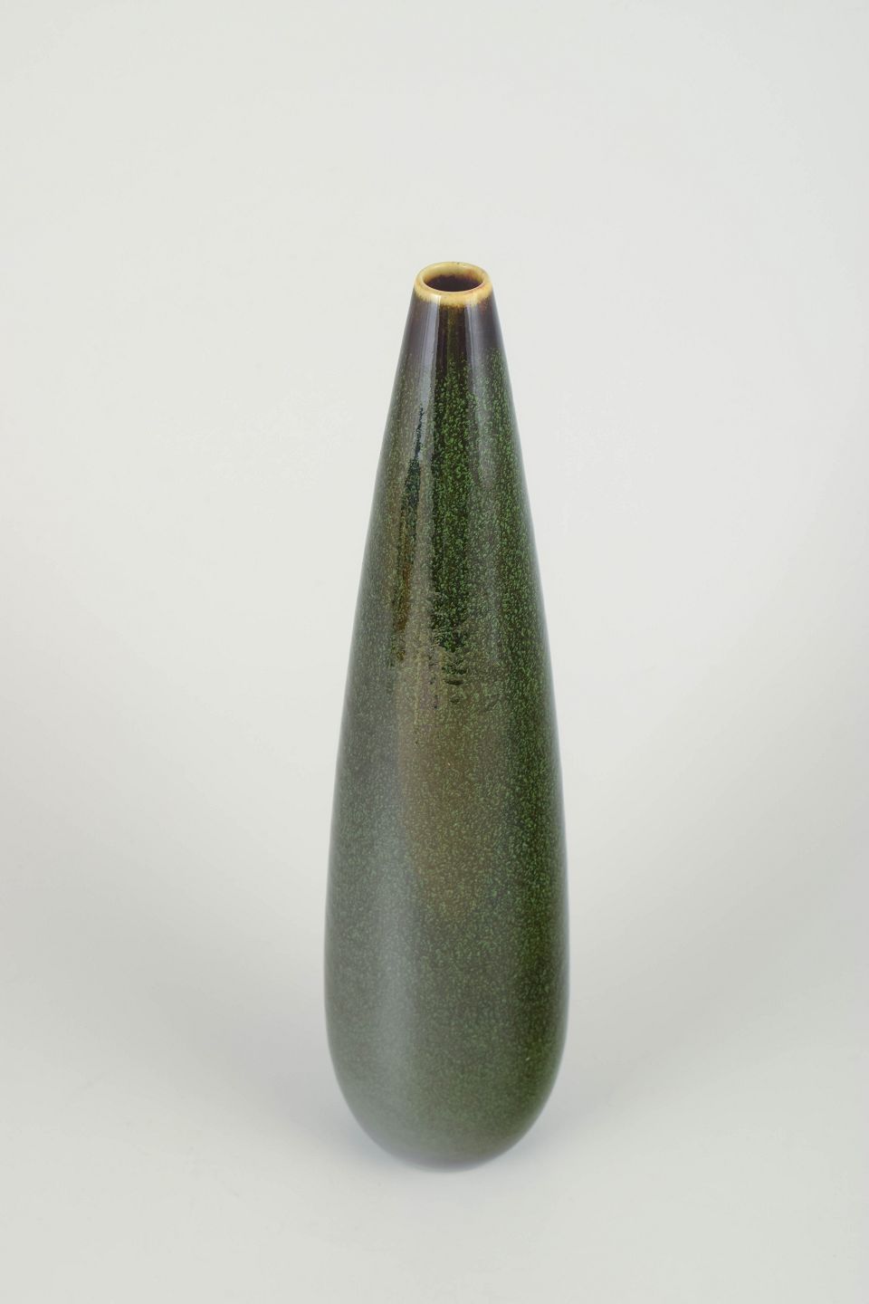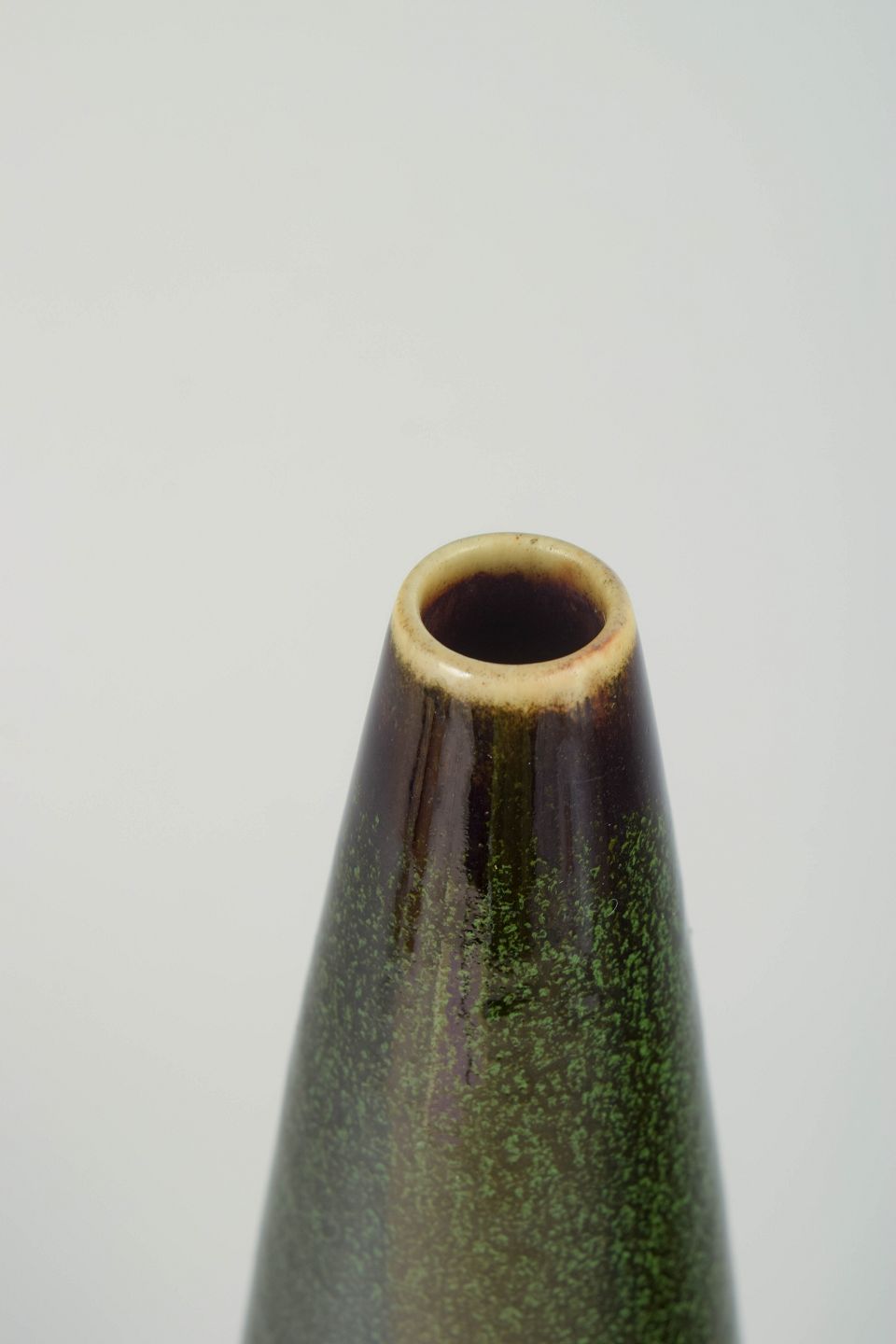 Høj cylindrisk skulpturel vase med elegant afsmalnende form og dyb, levende grøn glasur med subtil spilvirkning — et raffineret eksempel på Stålhane’s modernistiske formsprog i stor skala.