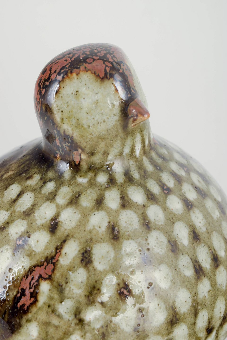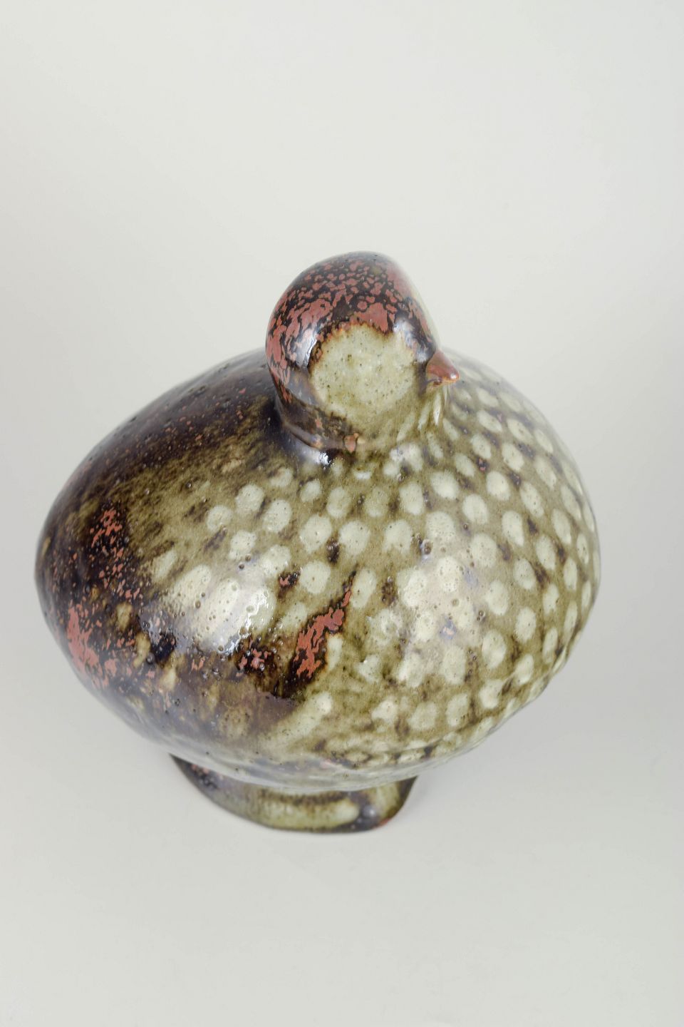 Sjælden stentøjsskulptur formet som fugl med karakteristisk organisk volumen og dyb, levende glasur med lyse pletter og kobberbrune partier – et signaturudtryk for Stålhane i hans eksperimenterende keramiske periode.