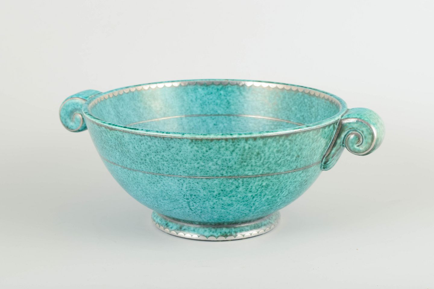 Wilhelm Kåge (1889–1960) served as head designer at Gustavsberg from 1917 and was a major figure in Swedish ceramic modernism. His Argenta series, introduced in the 1930s, combines cool glazes with refined silver inlays and is regarded as a masterpiece of Scandinavian Art Deco.