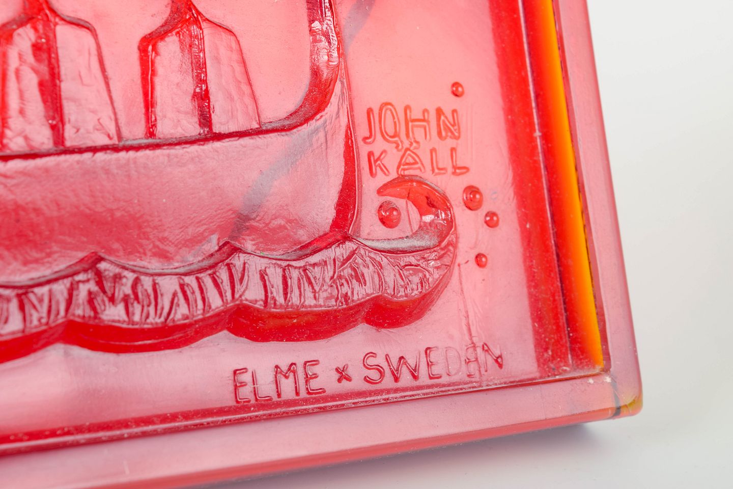 Elme Glasbruk (1928–1979) in Småland, Sweden, was renowned for its richly coloured pressed glass and decorative Nordic folk-inspired motifs. John Käll was among the designers who created striking wall reliefs and sculptural objects for the modern Scandinavian home.