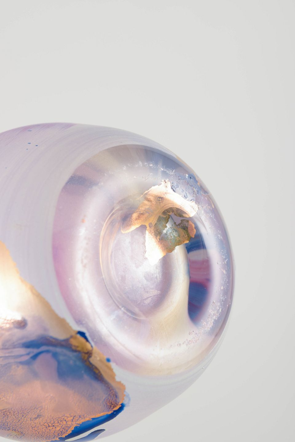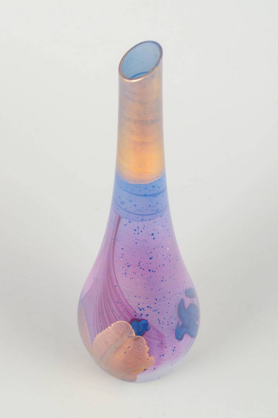 Elegant slender art-glass vase in mouth-blown glass with iridescent surface in pastel rose, blue and golden tones with embedded organic colour elements.