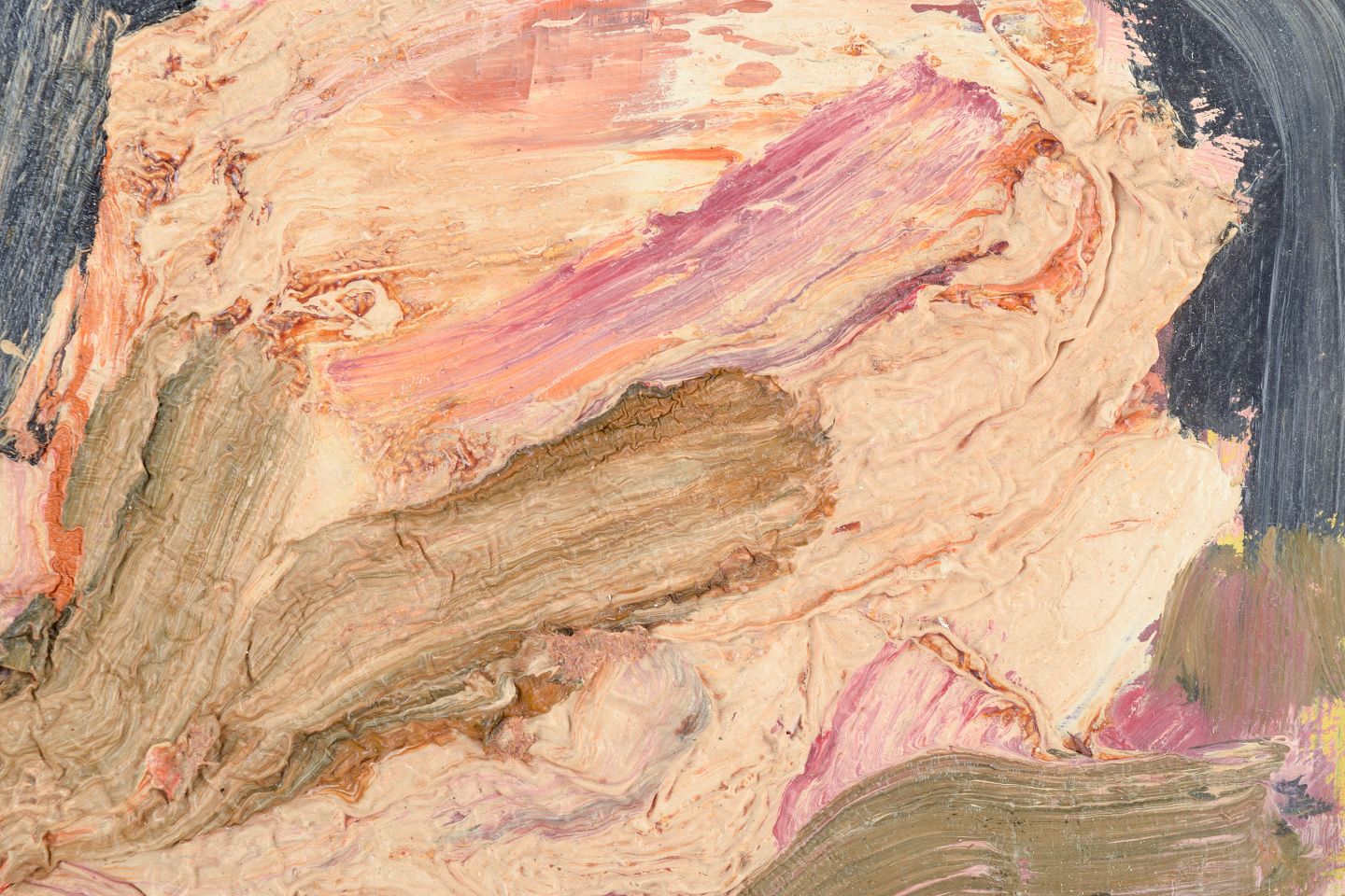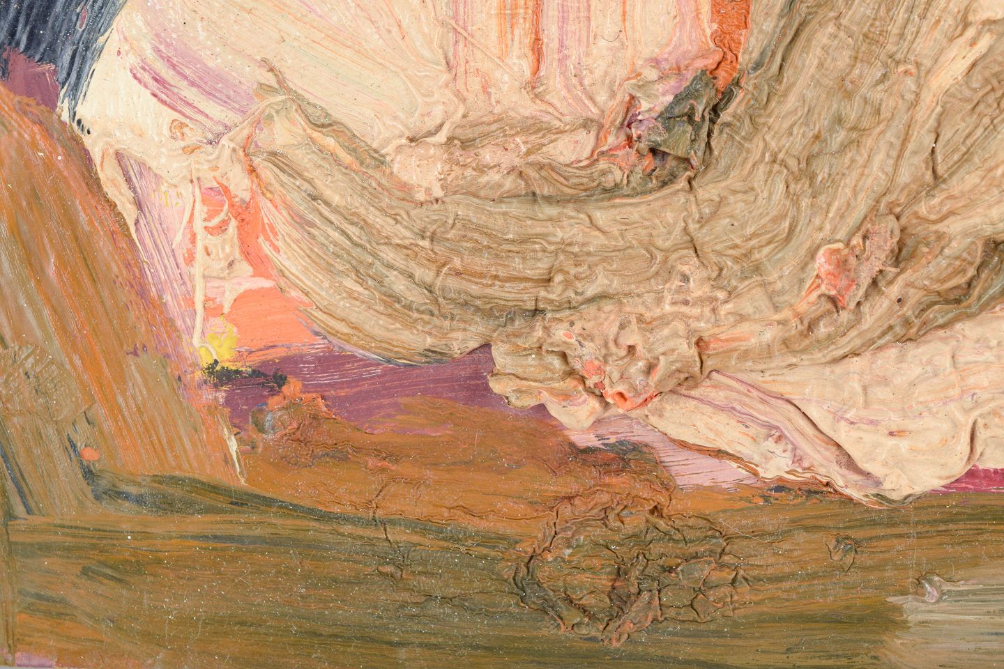 Et råt og ekspressivt abstrakt maleri udført med kraftige, pastose pensel- og spartelstrøg. Farvepaletten domineres af hudtone, jordfarver og mørkeblå/sort i et organisk, næsten landskabs- eller figurativt antydende motiv. Den taktile overflade og kropslige energi i påføringen af malingen peger mod en informel/tafri stil beslægtet med europæisk efterkrigs-ekspressionisme.