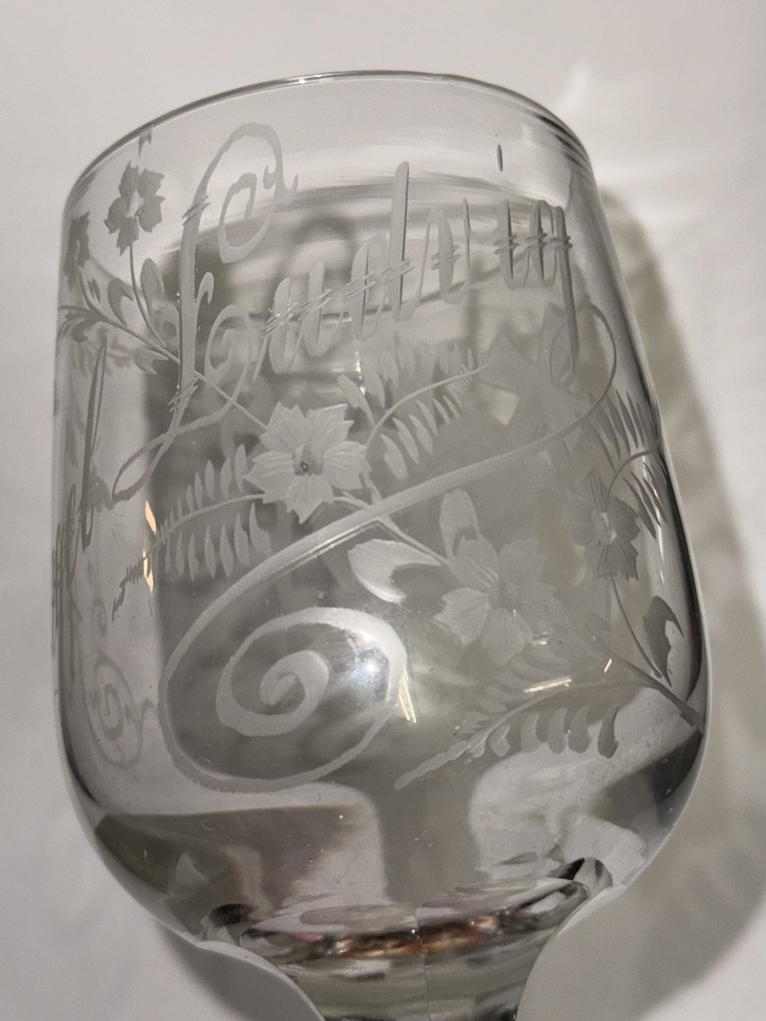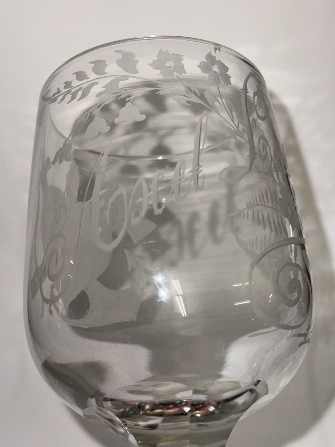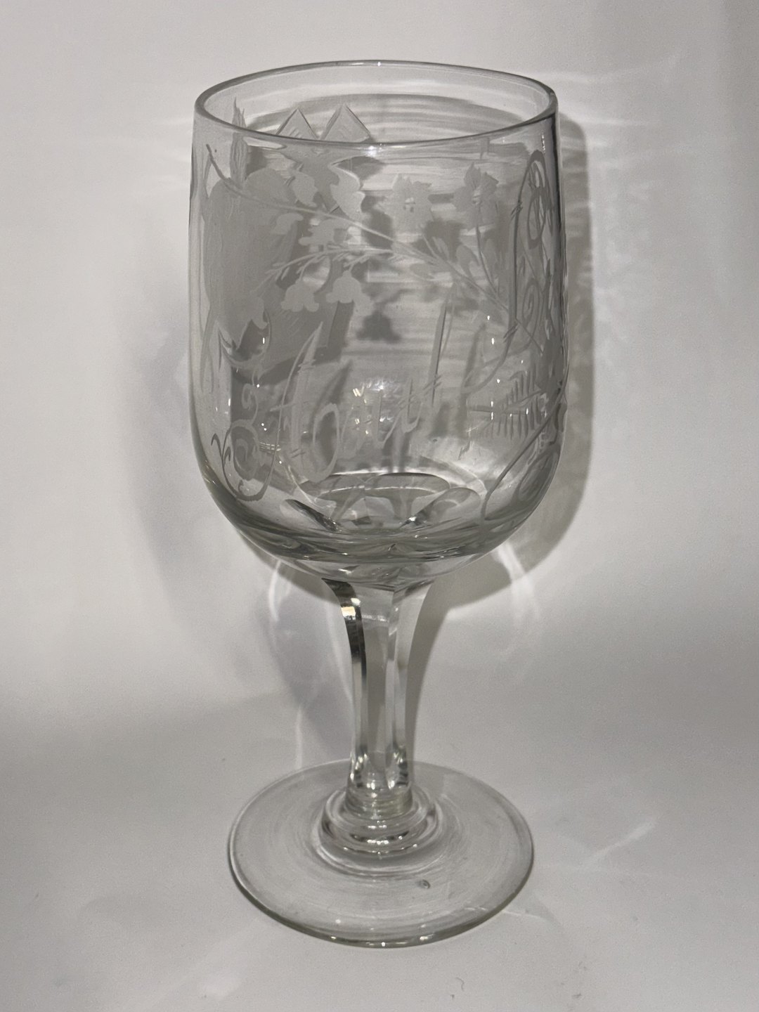 Gammelt vinglas fra Aalborg Glasværk fra omkring 1900. Dekoreret med navnet “Axel Ludvig”. Facetteret stilk.
