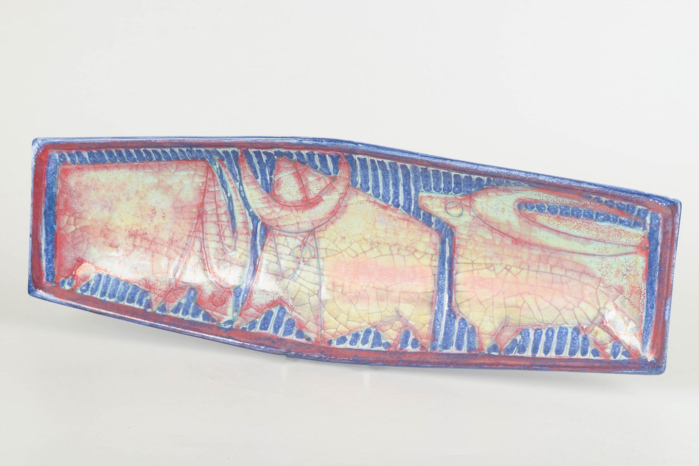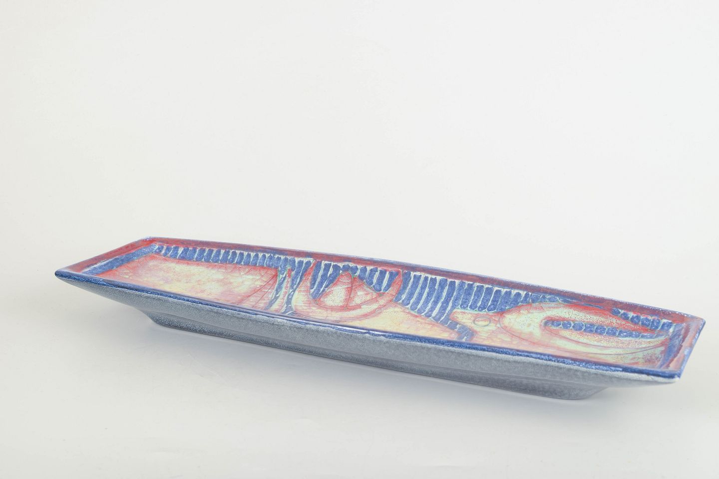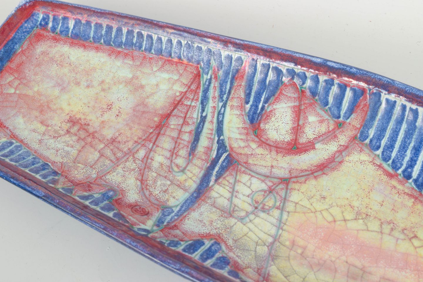 Aflangt rektangulært fad i glaseret stentøj med karakteristisk grafisk dekoration i rød-rosa og koboltblå nuancer med tydelig craqueléeffekt — typisk for Starcks modernistiske formsprog hos Bornholmske Michael Andersen.