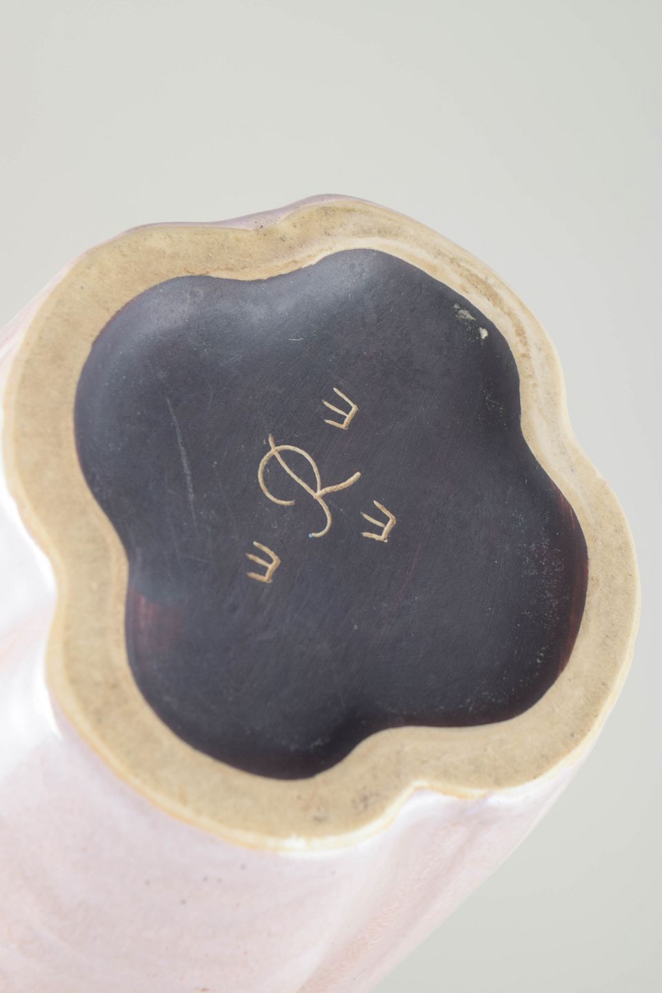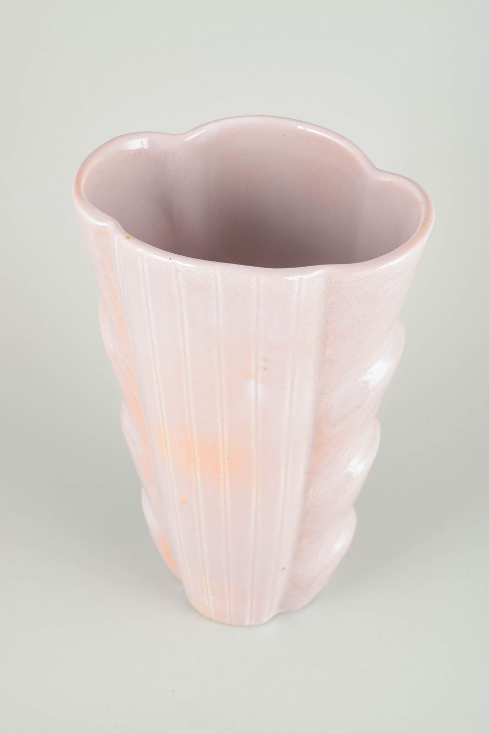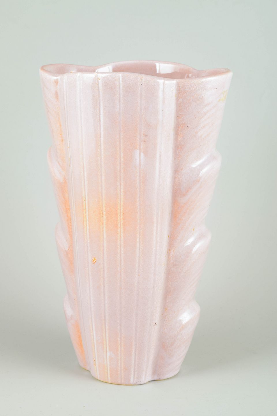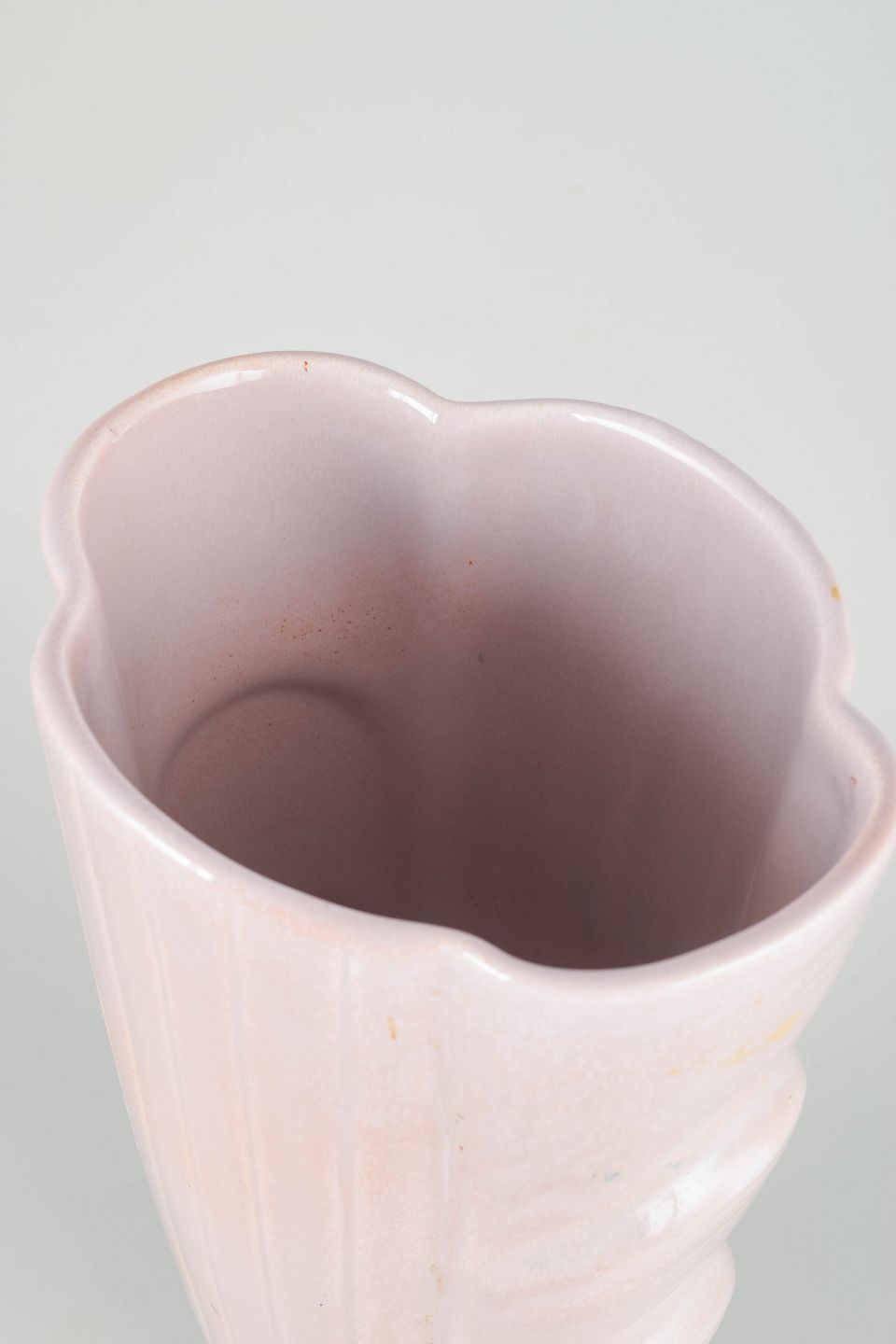 Impressive glazed ceramic vase in a soft pink tone with distinctive ribbed and organic relief decoration. A fine example of Rörstrand’s mid-century design, combining functionalism with decorative artistry.