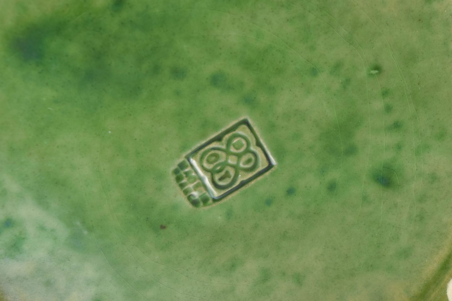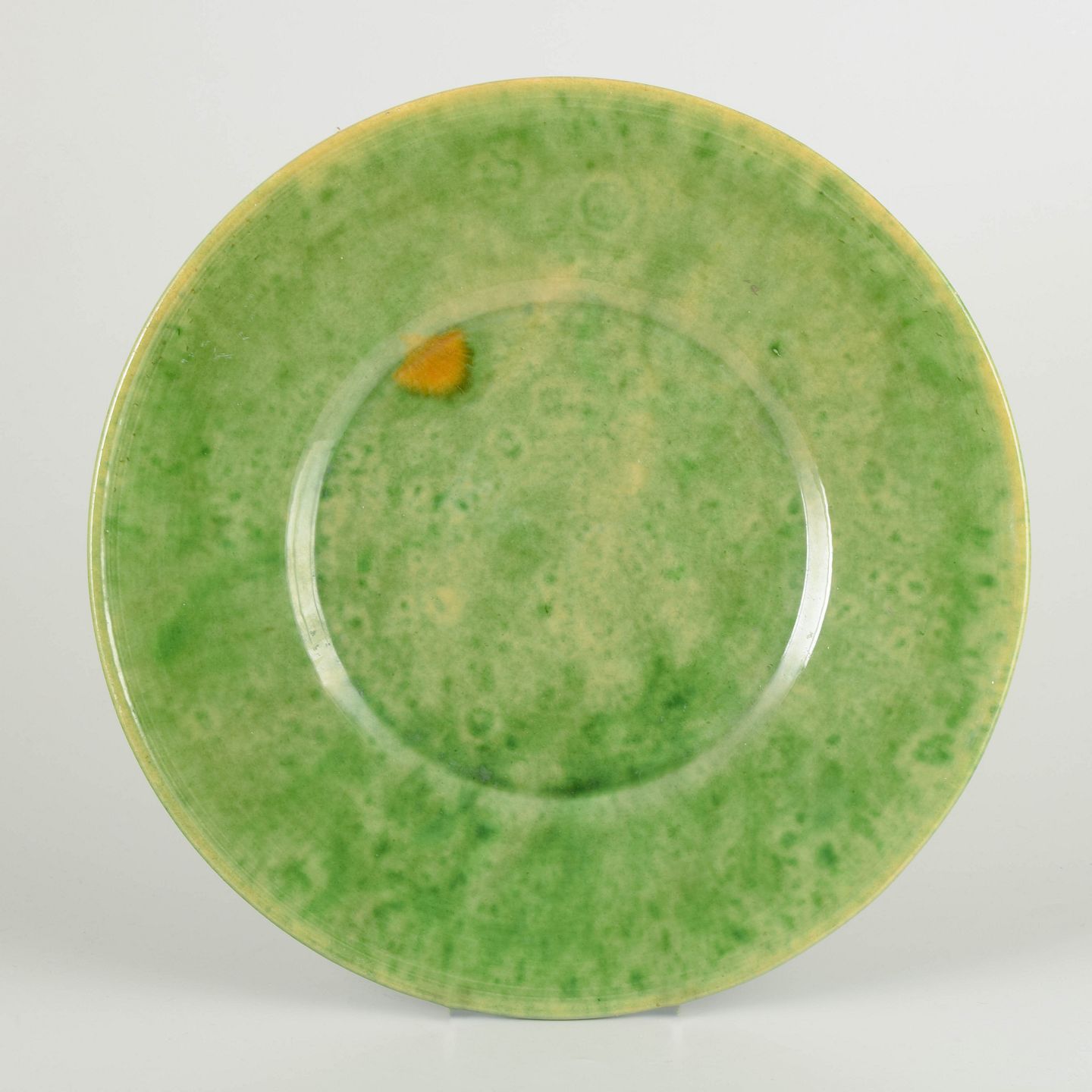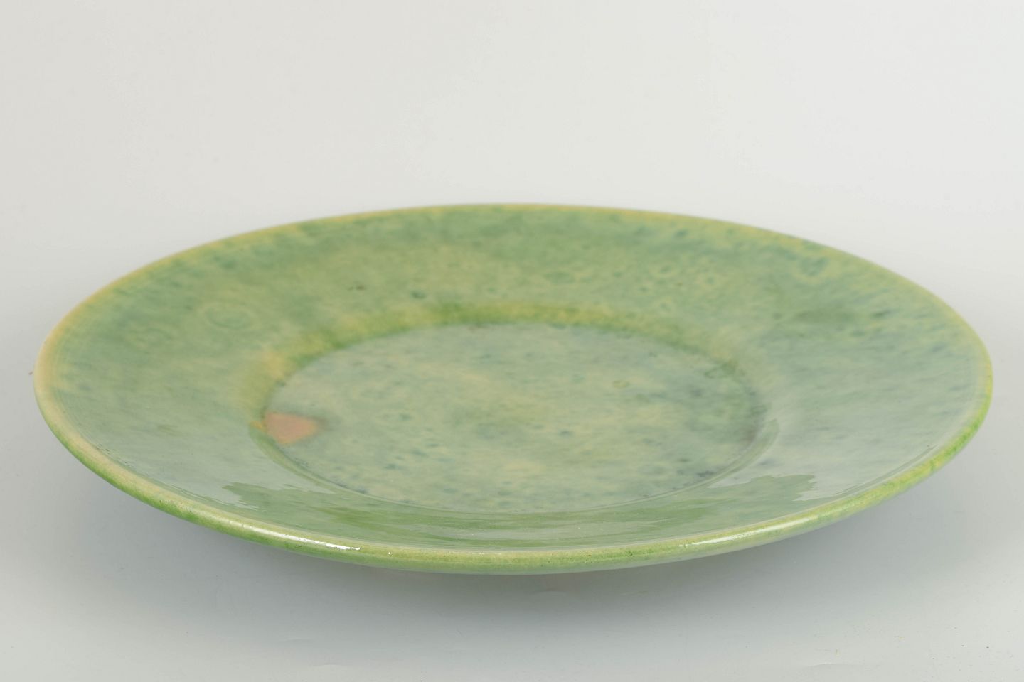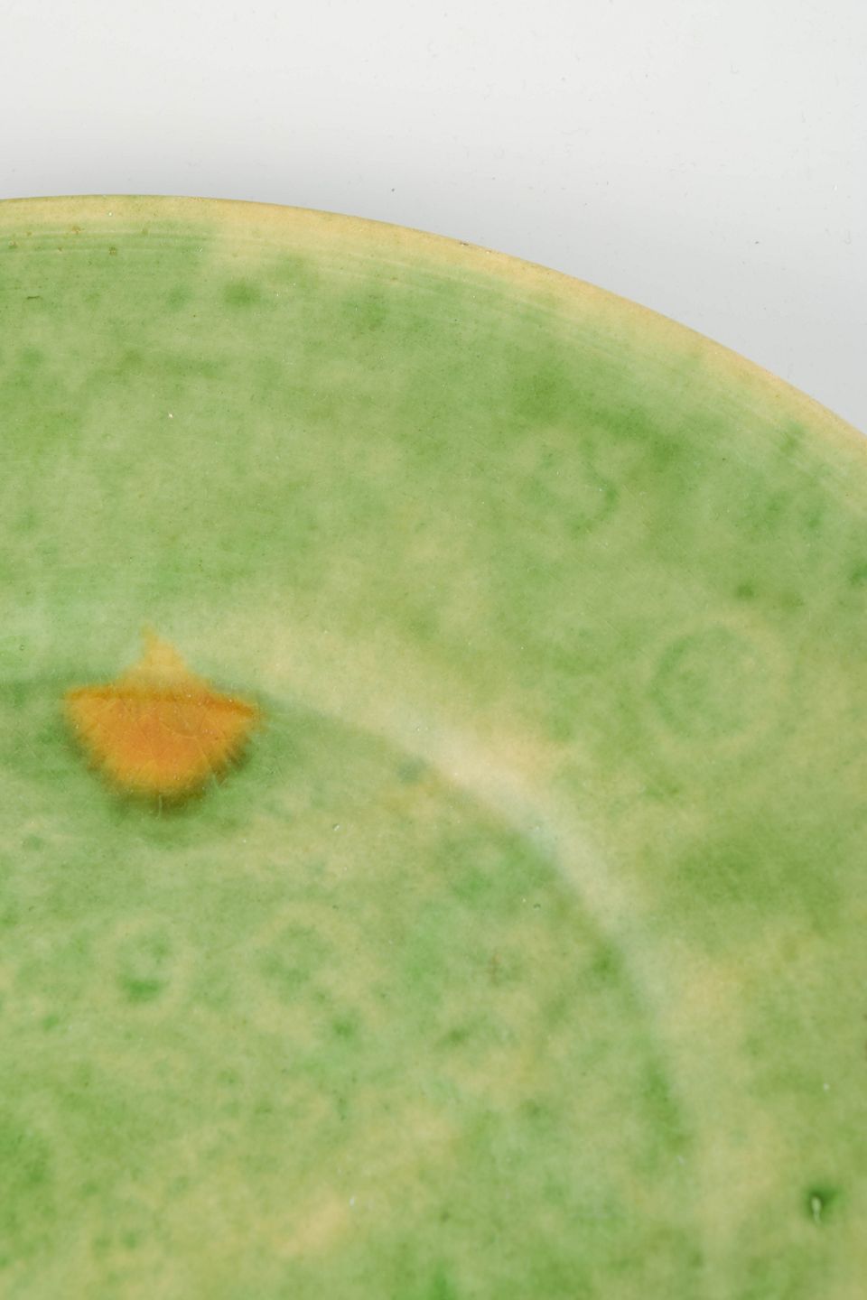 Håndlavet fad i stentøj med levende grøn glasur med nuancer af gult og spor af brændingsmærke. Klassisk for studiomiljøet i Biot, Sydfrankrig, kendt for sine rustikke former og naturinspirerede glasurer.