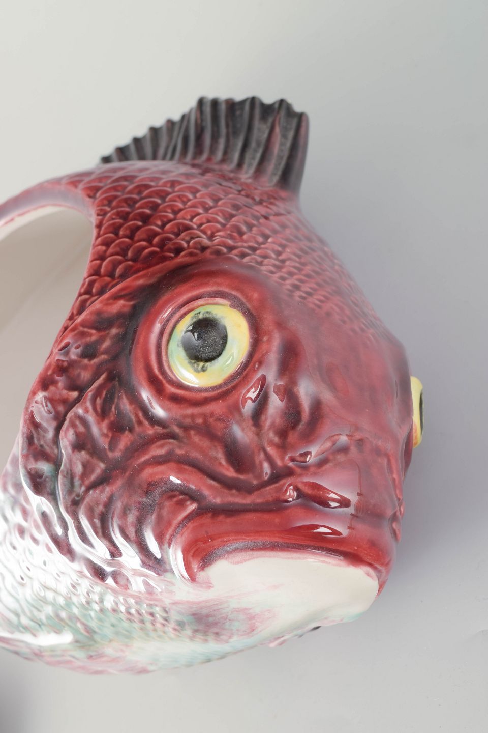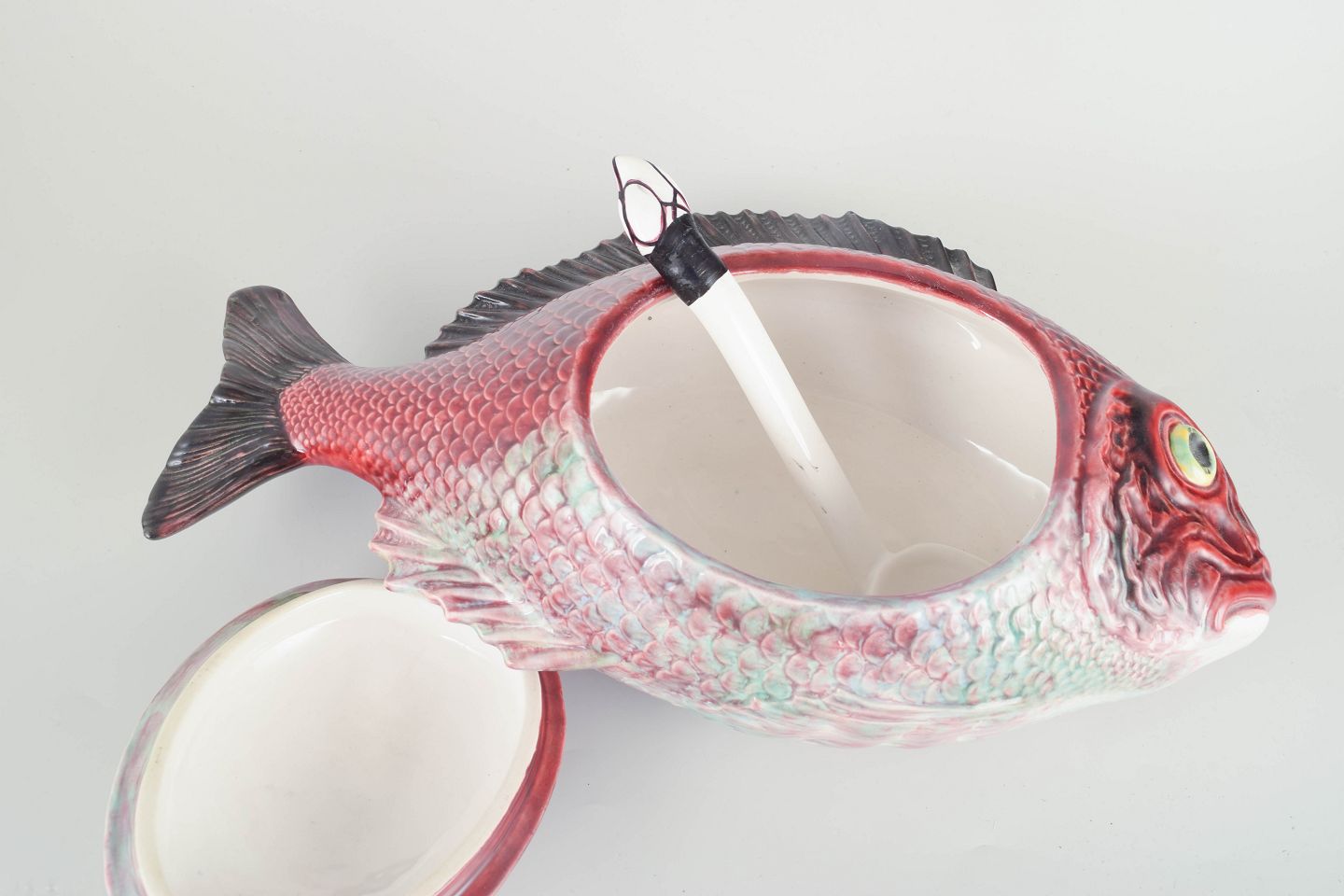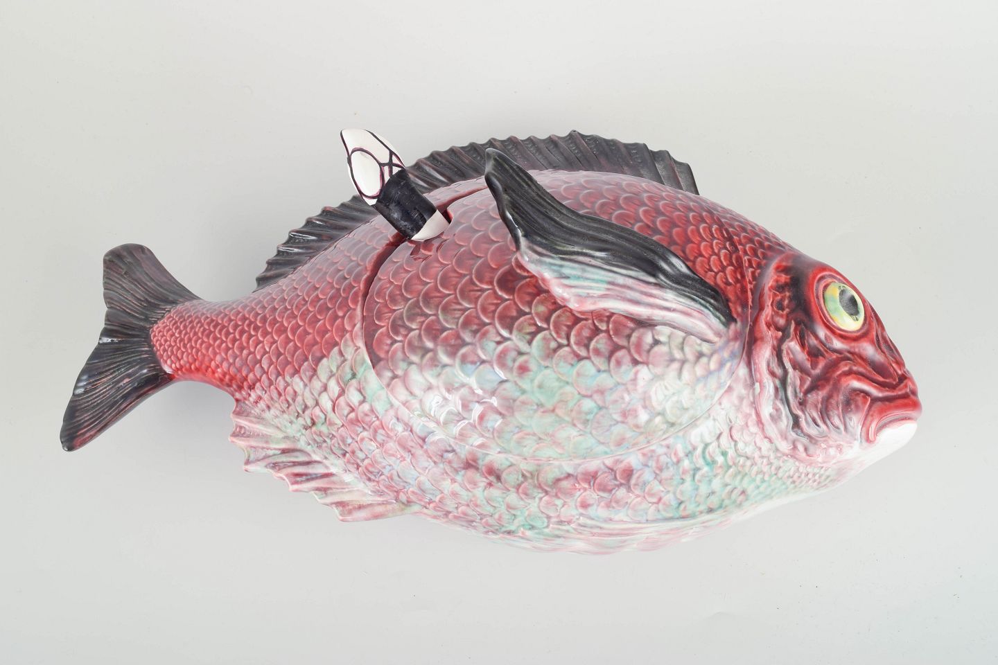 Decorative and humorous tureen shaped as a fish with lid and matching ladle. Hand-painted in vivid tones of red, green, and grey, with finely modelled details in the fins and scales. A characterful and rare serving piece combining function with sculptural presence.