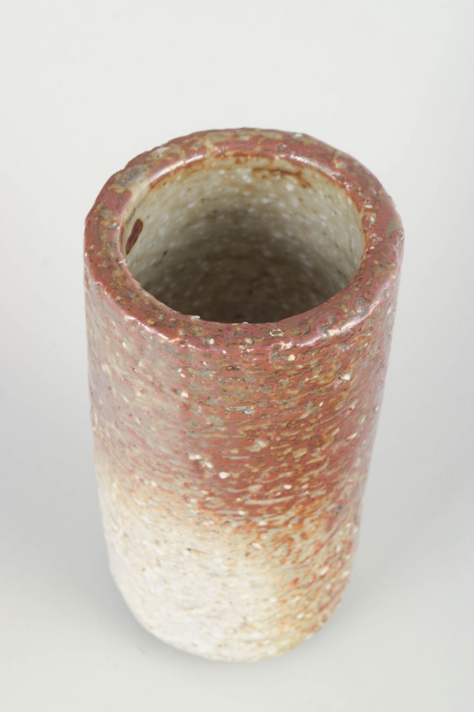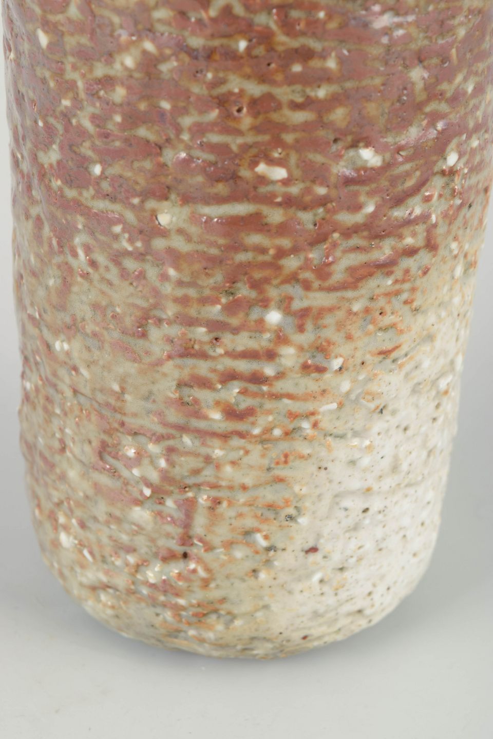 Høj cylindrisk vase i stentøj med grov, struktureret overflade og glasur i nuancer af hvid, rosa og grå. Et karakteristisk eksempel på Nylunds sene periode hos Rörstrand, hvor materialitet og håndværksmæssig tekstur var i fokus.