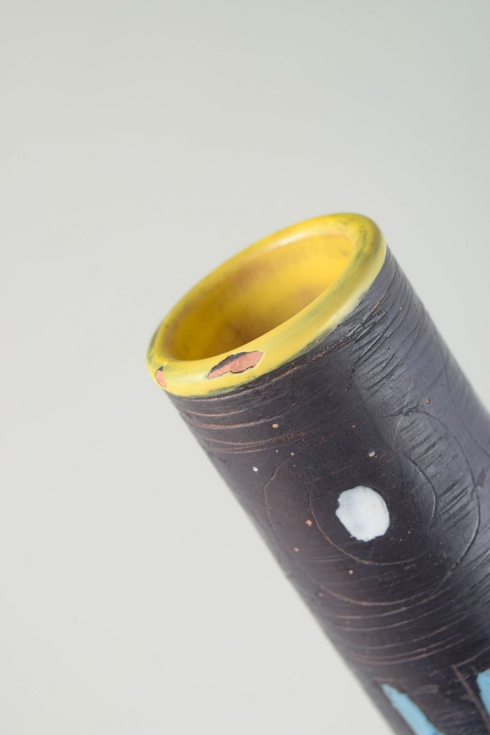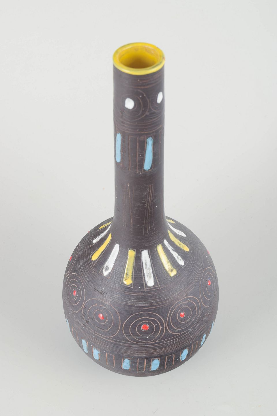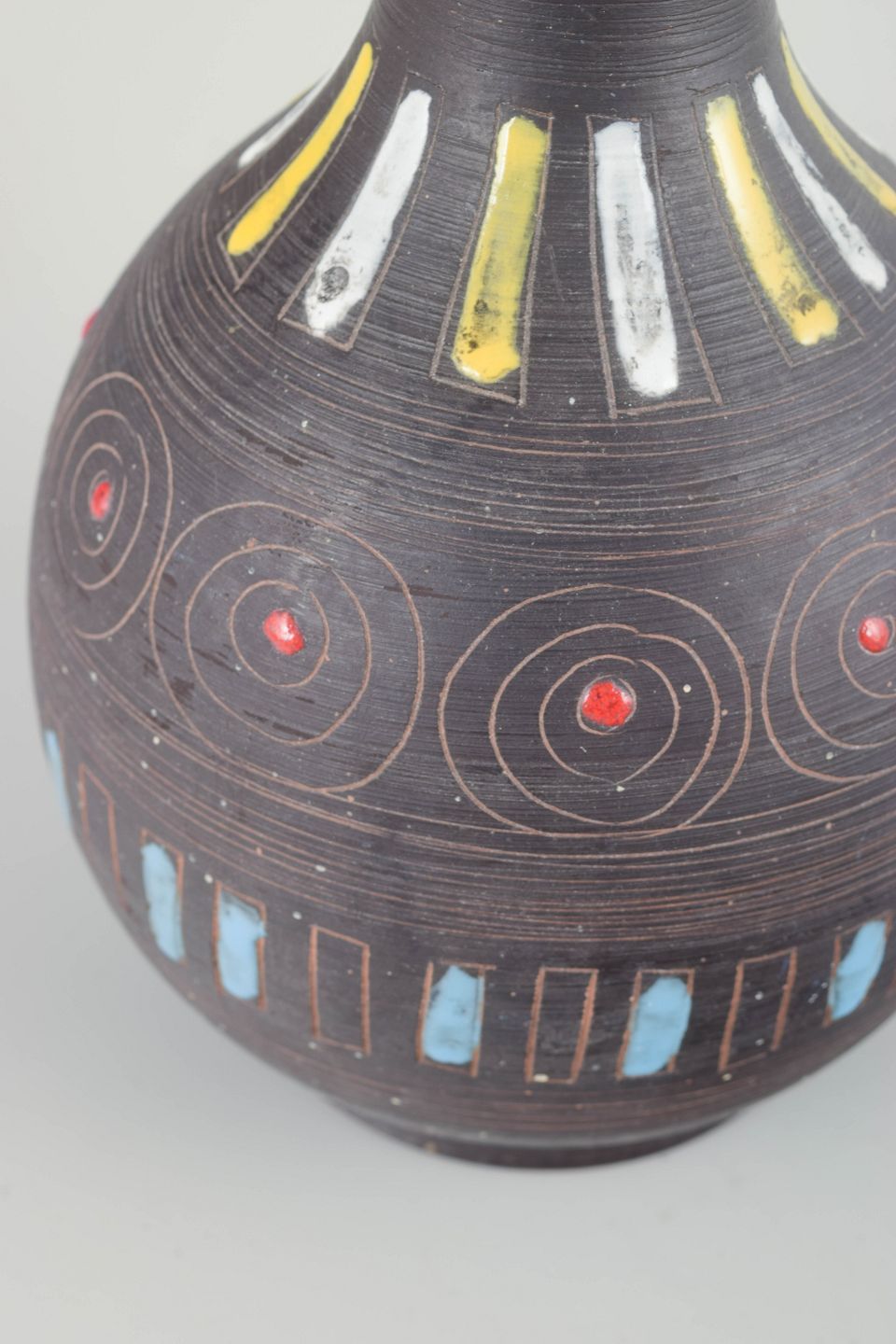 Hand-painted ceramic vase with a slender neck and decorative geometric pattern in black, blue, yellow, and red. A fine example of Italian studio pottery from the 1960s, featuring vibrant colours and a graphic expression.