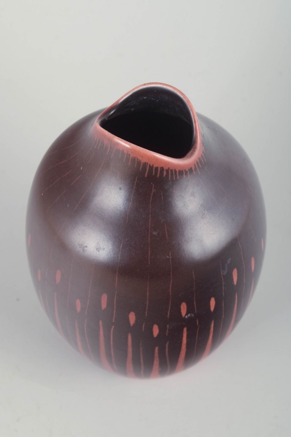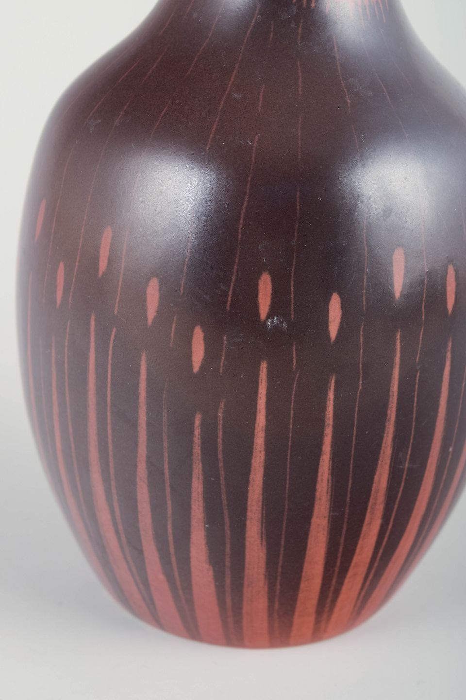 Elegant og karakteristisk vase i rødlig og brunlig lertone med hånddekoreret lodret mønster og organisk formet åbning. Undersiden mærket Beswick England 1399 samt signeret af Colin Melbourne.