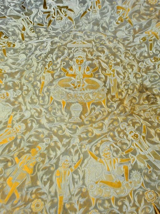 Arabisk rygebord med messingplade fra Indien, 19./20. årh. Messsingplade dekoreret med Guder. Understel i træ med indlagt perlemor. H.: 47,5 cm. Dia.: 77,5 cm.