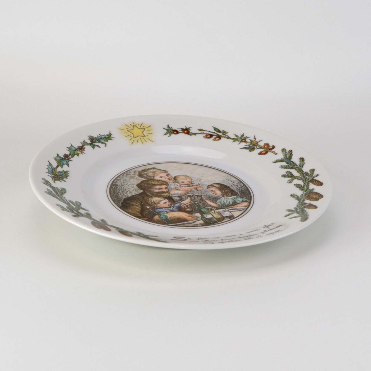 Flad desserttallerken i kongeligt porcelæn fra serien Peters Jul med motiv af julebordet med familien. Nr. 6