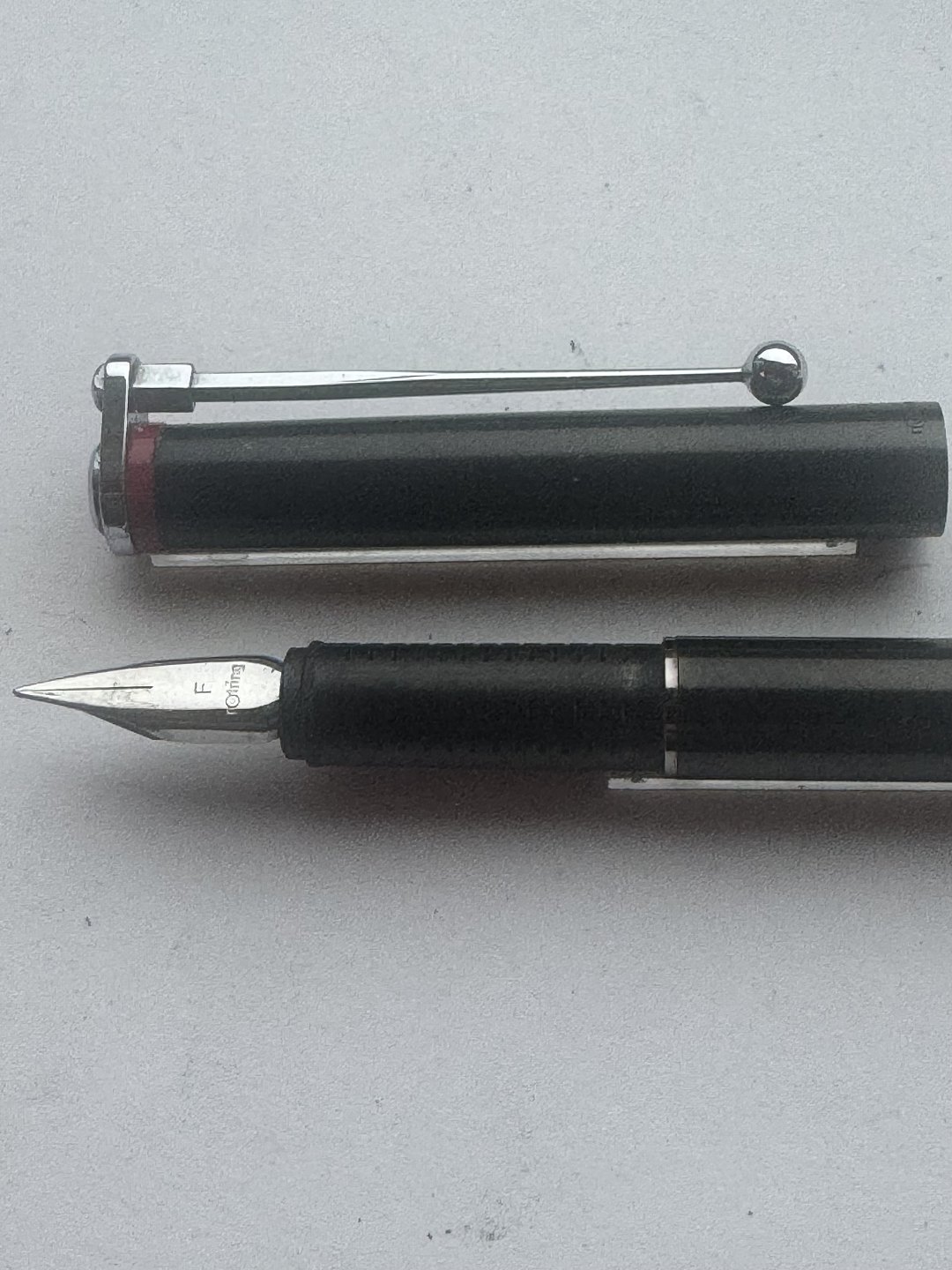 Rotring 700 fyldepen i stål fra 1990’erne. Fremstår i god og skriveklar stand. Mangler blot ny blæk-patron (cartridge) for at kunne skrive igen. Længde 14 cm.