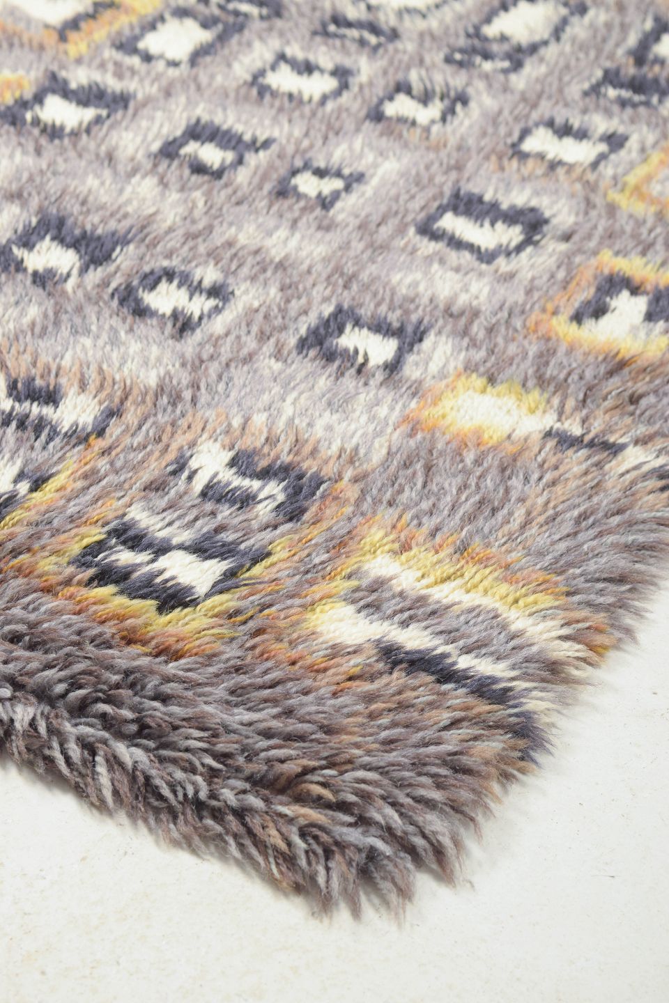 Håndknyttet rya-tæppe i uld med geometrisk mønster i grå, creme, gul og sorte nuancer. Et grafisk og harmonisk design, typisk for skandinavisk tekstilkunst i perioden, hvor modernistiske principper blev oversat til dekorative, håndlavede tekstiler.