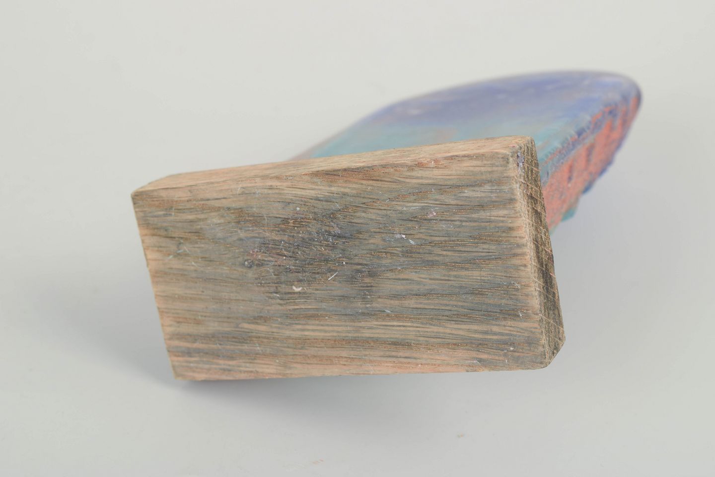Unika, håndlavet glasskulptur med stiliseret ansigt, udført i massiv glas med iriserende overflade i blå, turkis og rosa toner. Monteret på træfod. Et karakteristisk eksempel på Ekegrens eksperimenterende arbejde med farve og struktur i glas fra 1980’erne.