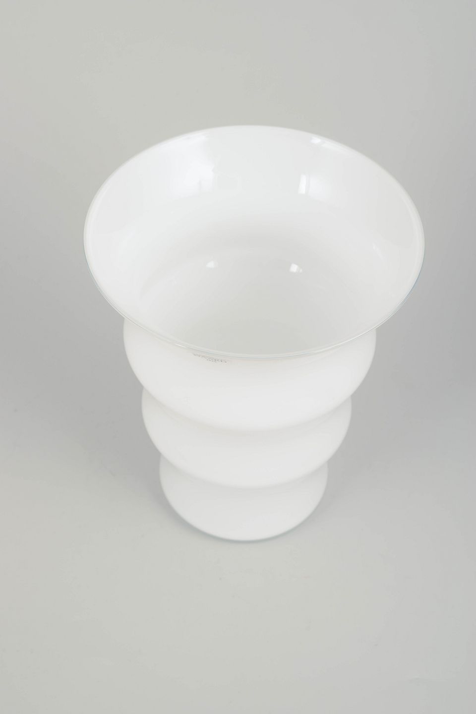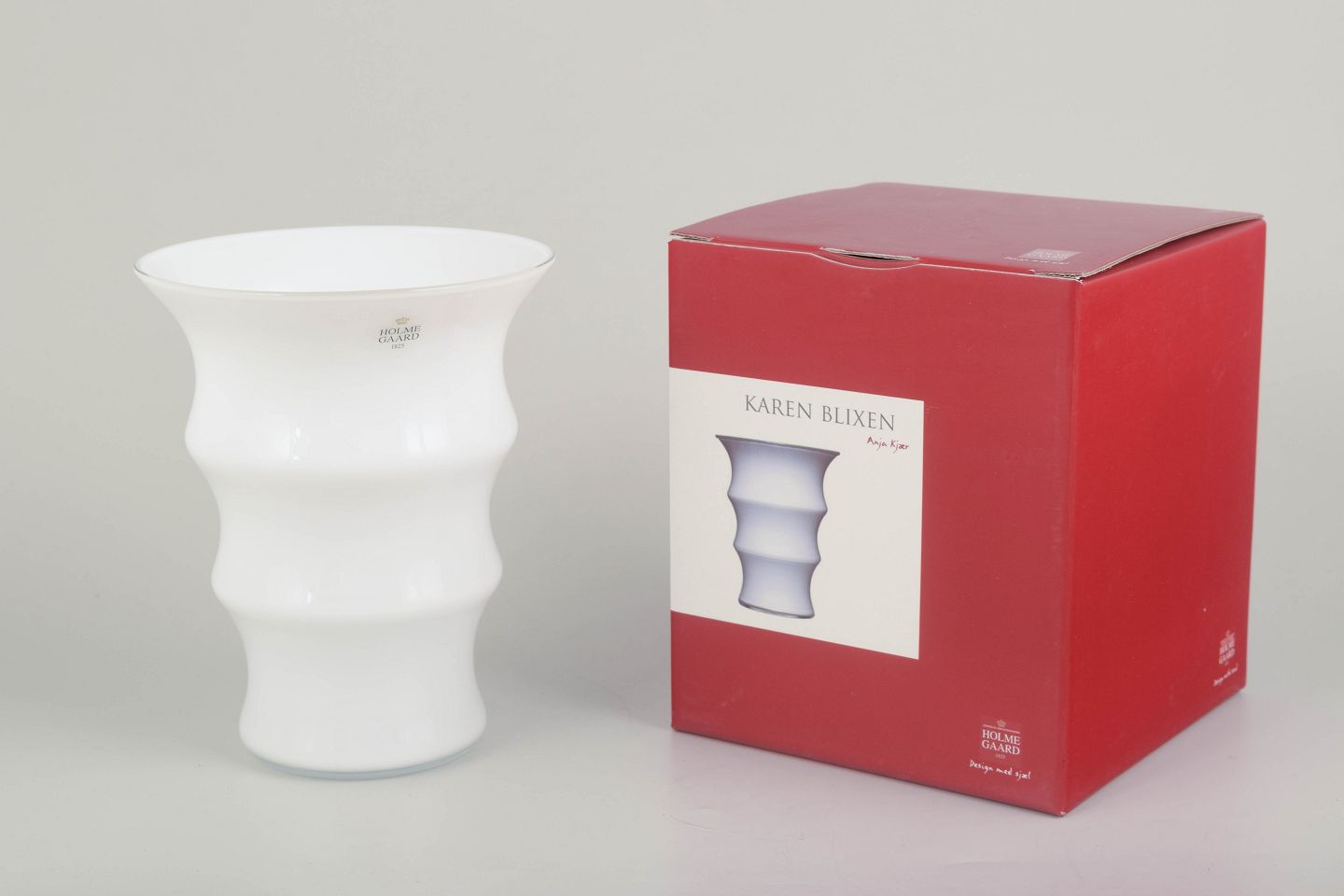 Elegant mundblæst vase i opalhvidt glas fra serien Karen Blixen, designet af Anja Kjær for Holmegaard. Karakteristisk bølget form med blød organisk silhuet. Original æske medfølger.
