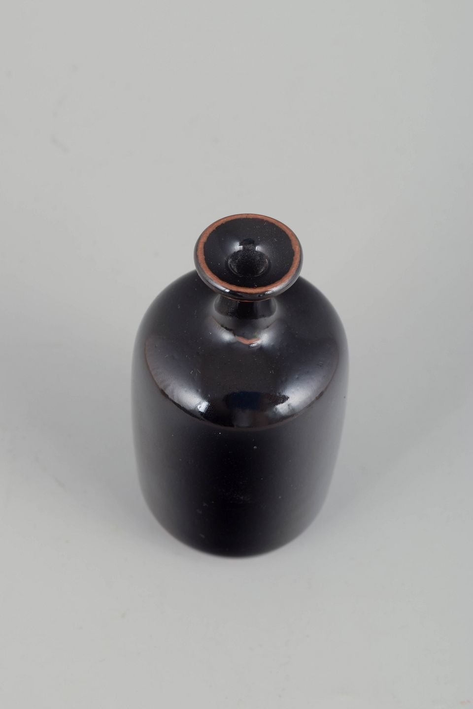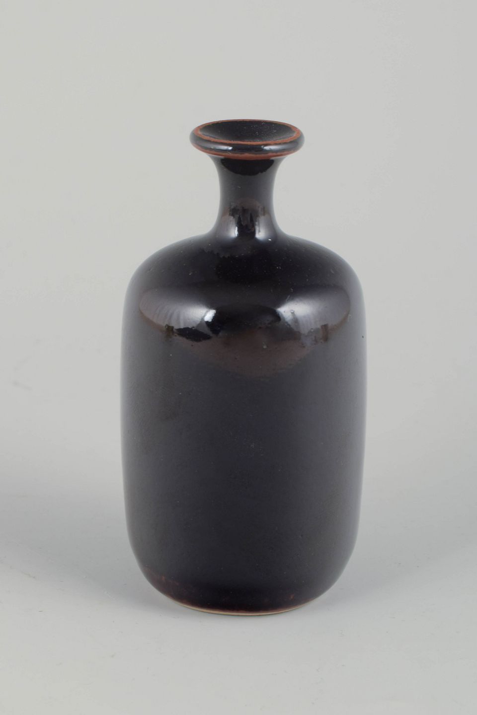 Unik hånddrejet miniaturevase i stentøj med mørk, blank glasur i dybe brun-sorte toner.