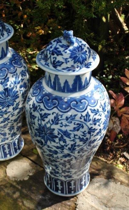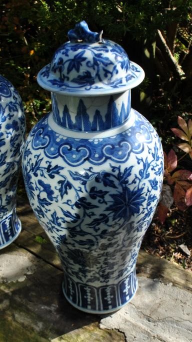 Par kinesiske låg krukker, blå/hvidt porcelæn, 19. årh. Håndmalet dekoration i form af blomster og mønstre. H: 46 cm.