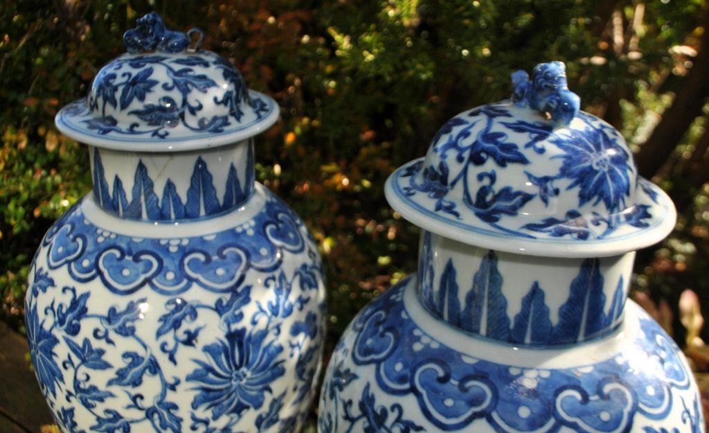 Par kinesiske låg krukker, blå/hvidt porcelæn, 19. årh.