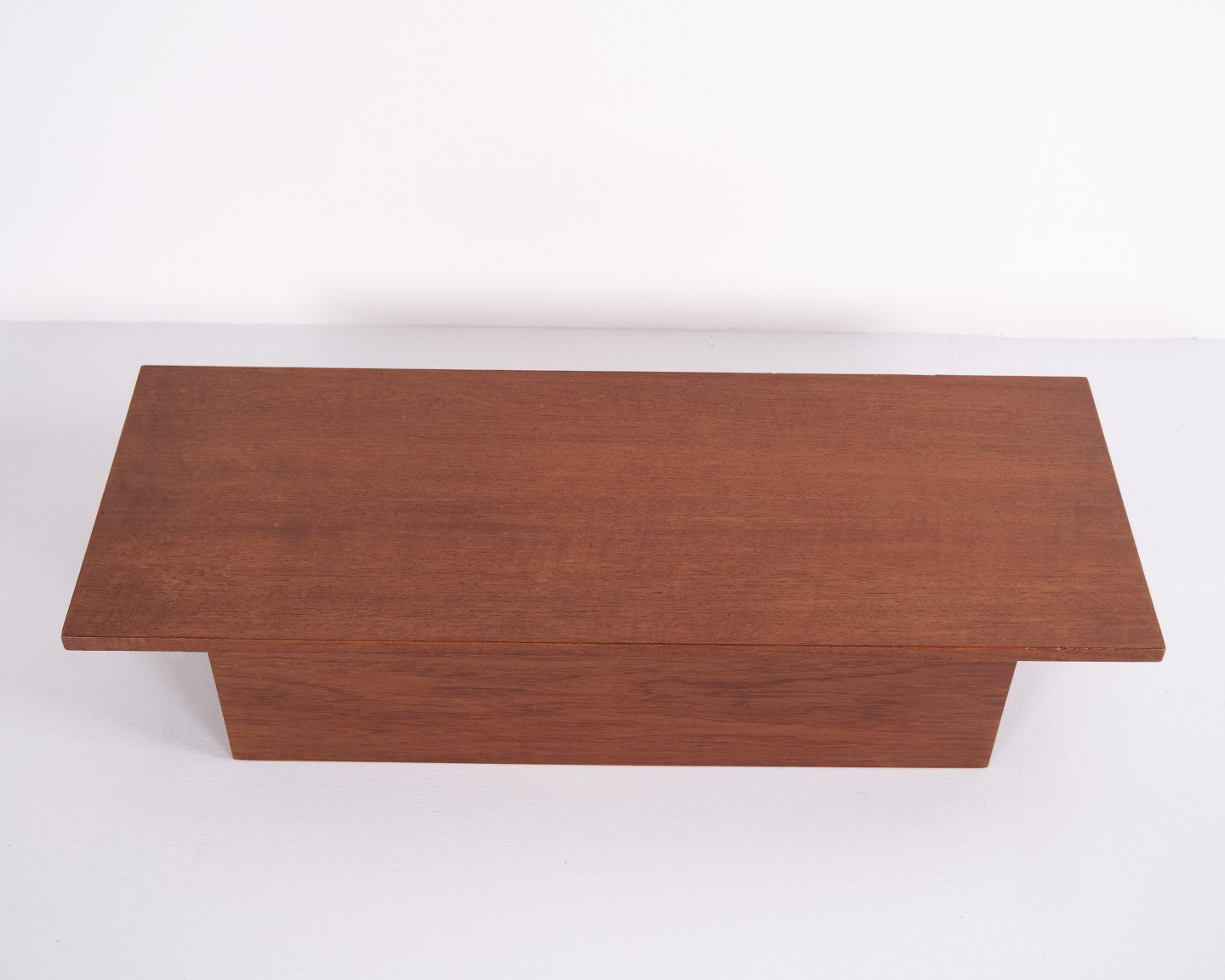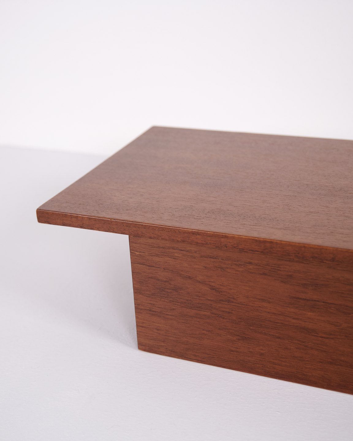 Væghængt hylde fra 1960’erne, udført i teaktræ med en rummelig skuffe integreret i fronten.