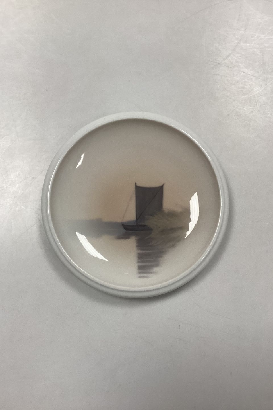 Royal Copenhagen Platte/Skål No. 2506/2568. Motiv med sejlbåd i aftenskumringen.