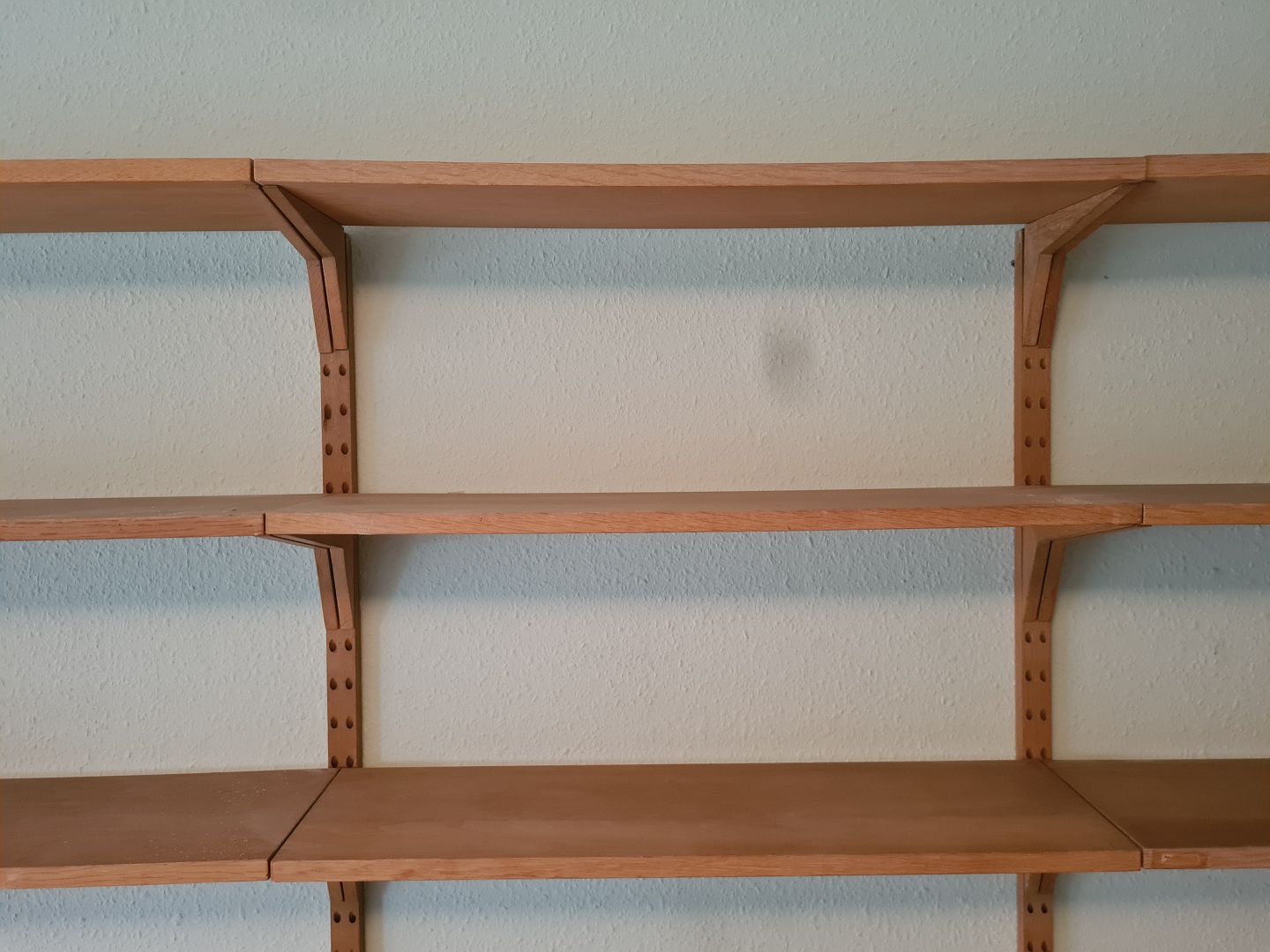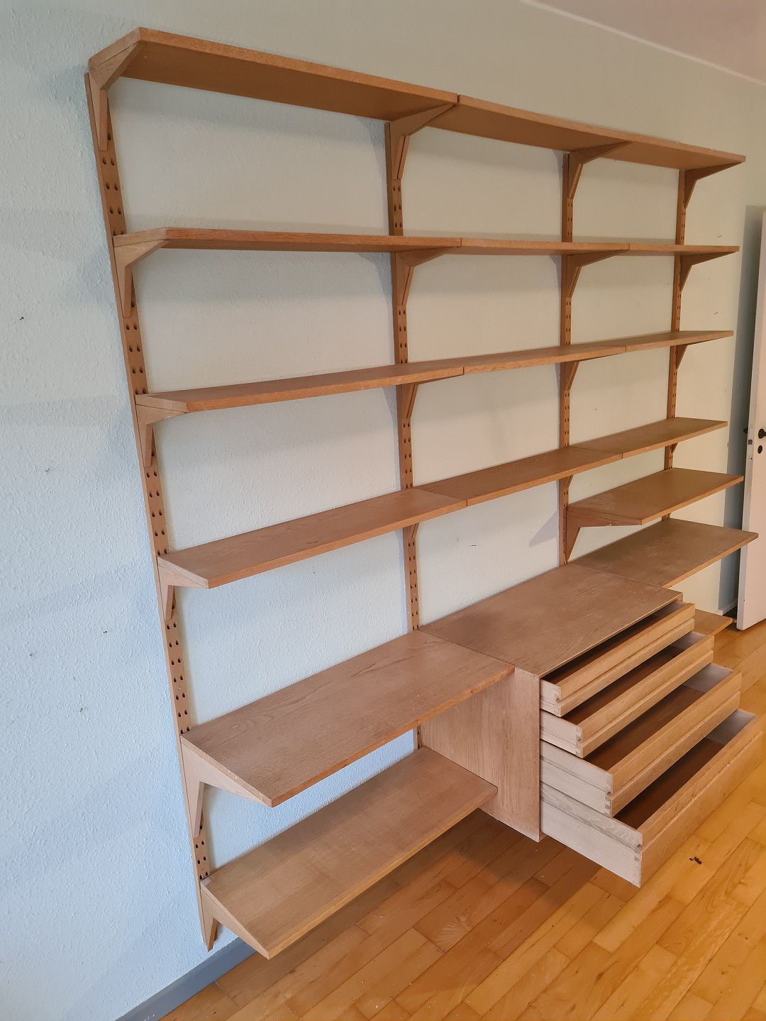 FM vægreolsystem fra 1960'erne i eg designet af Kai Kristiansen. Sættet består af 1 kommode (HxBxD 52x80x38), 2 hylder (HxBxD 2x80x38), 3 hylder (HxBxD 2x80x30), 12 hylder (HxBxD 2x80x33) og 4 vanger til ophængning. Generelt i pæn brugt stand dog svajer et par hylder en anelse. (Billede)