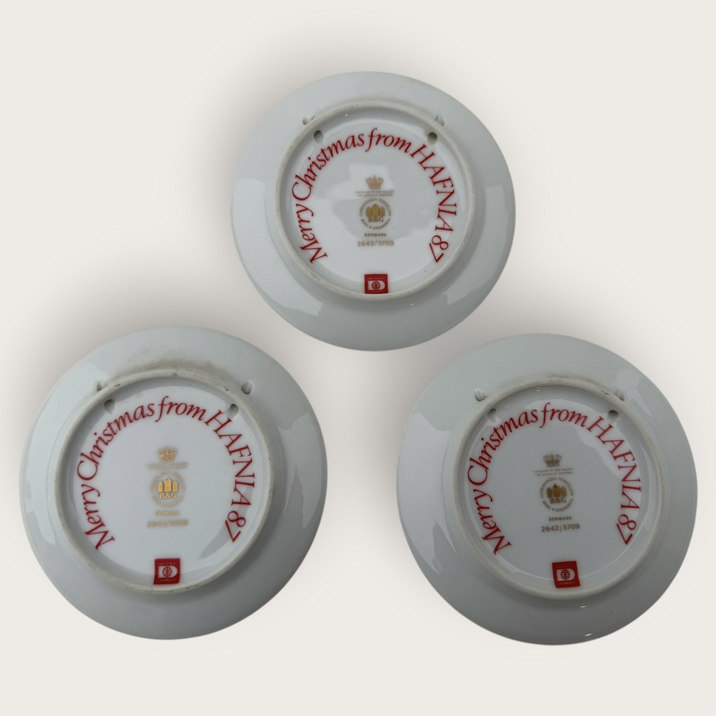 Bing & Grøndahl, 3 små juleplatter, Merry Christmas Hafnia 87, #2642/5709, 2643/5709 og 2644/5709, diameter 10,5cm, 1. sortering *fin stand*