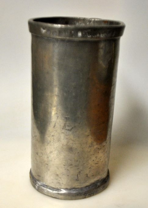 Stort målebæger i tin, 19. årh. England. Stemplet. Til 1. liter. H: 17,5 cm.