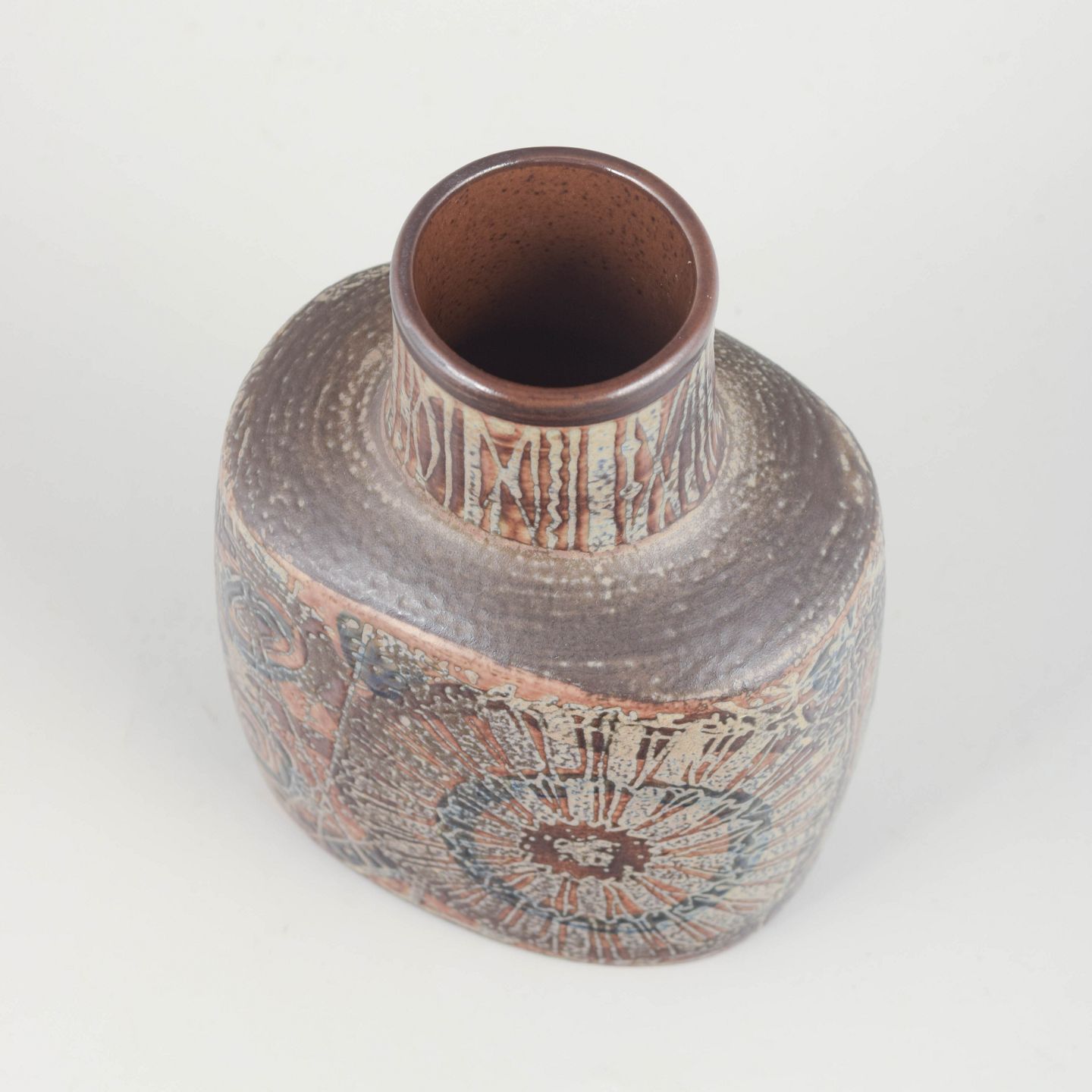 Rektangulær vase i stentøj med rundet skulder og karakteristisk hånddekoreret glasur i blå, beige og brunlige nuancer fra Thorssons Baca-serie. Dekoreret i relief med abstrakte og naturinspirerede motiver, typiske for Thorssons formsprog i perioden.