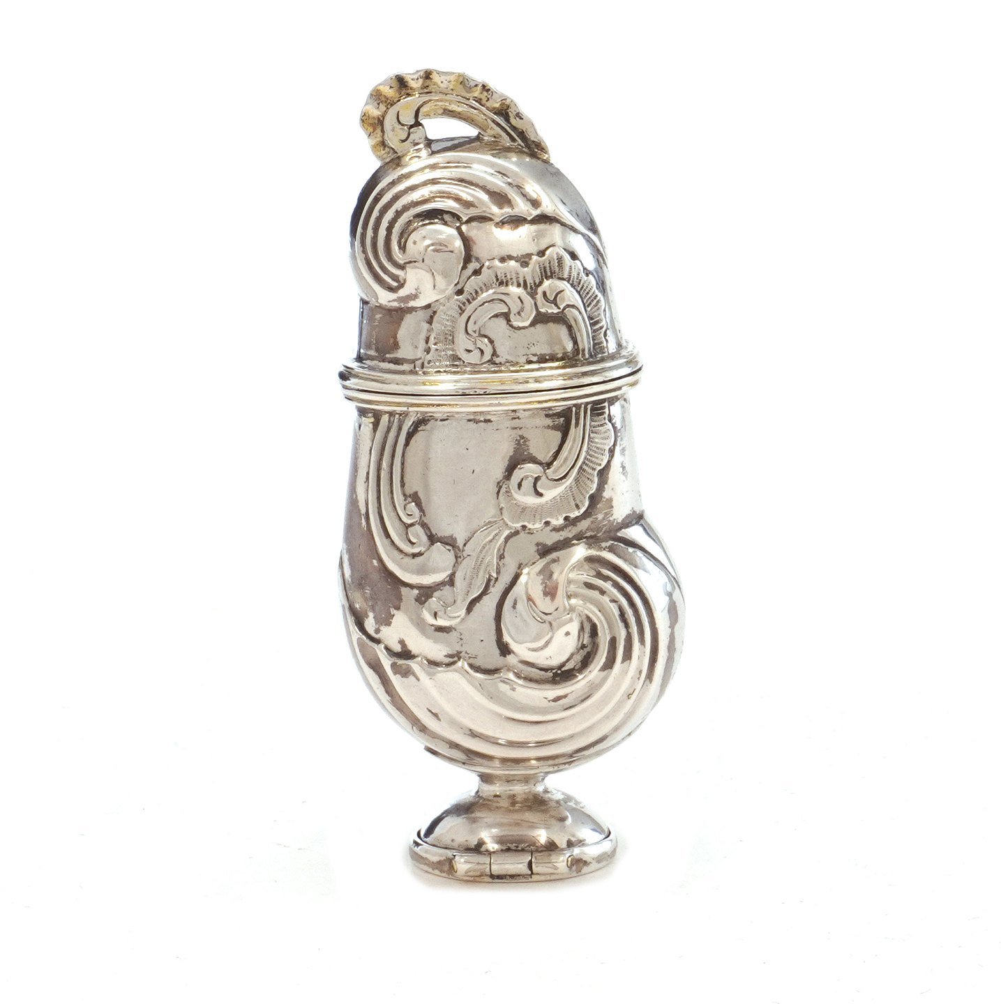 Hovedvandsæg i sølv såkaldt "Haneæg". Mester Joachim Weller, 1754-92, Holstebro. H: 8,2cm |