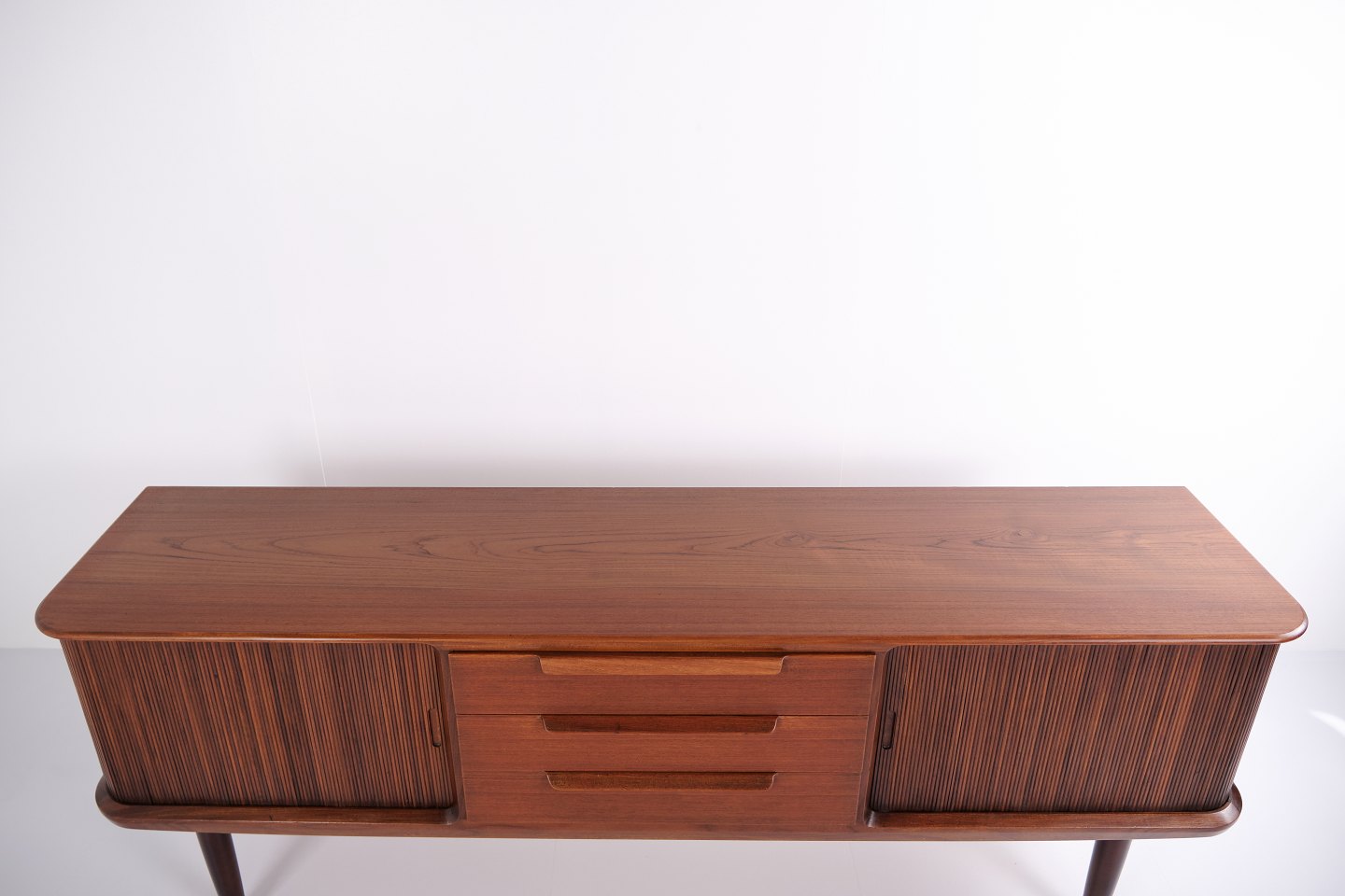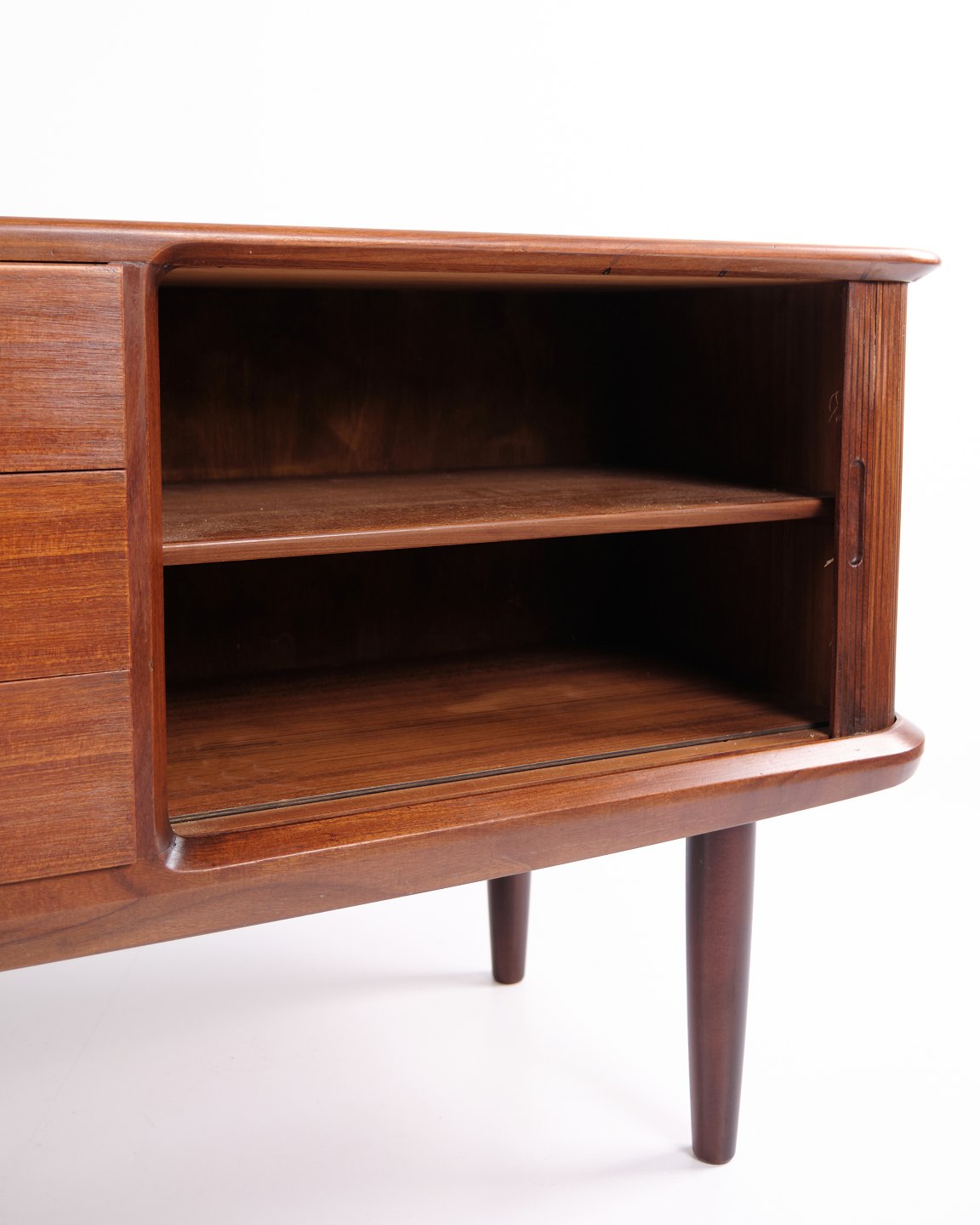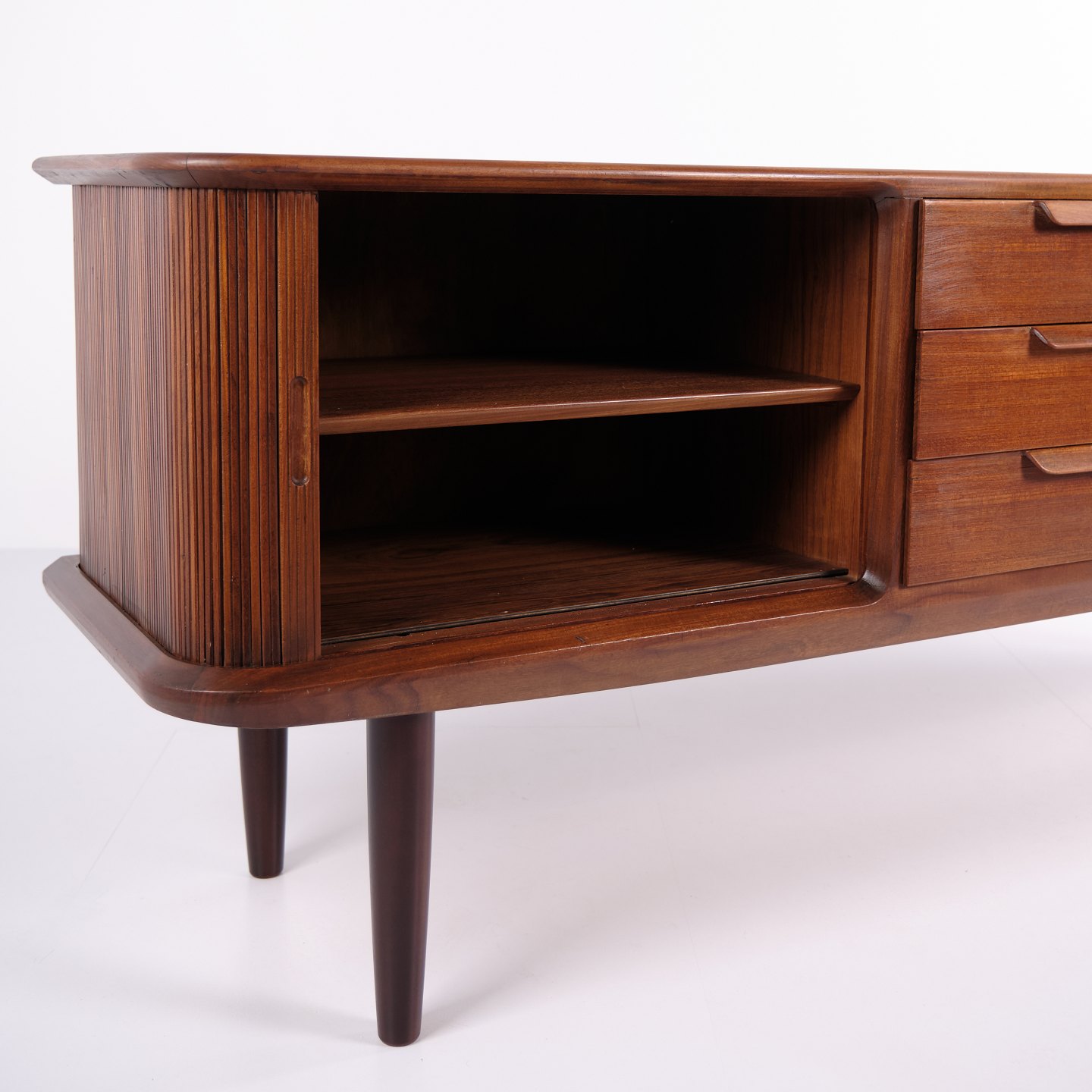 Skænk fra 1960’erne, udført i teaktræ med tre centrale skuffer og jalousilåger i siderne.